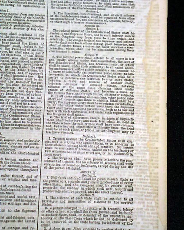 The last two columns of the front page contain the full text of new Confederate Constitution including the Preamble. This historic text carries over to take more than two columns on the back page as well.