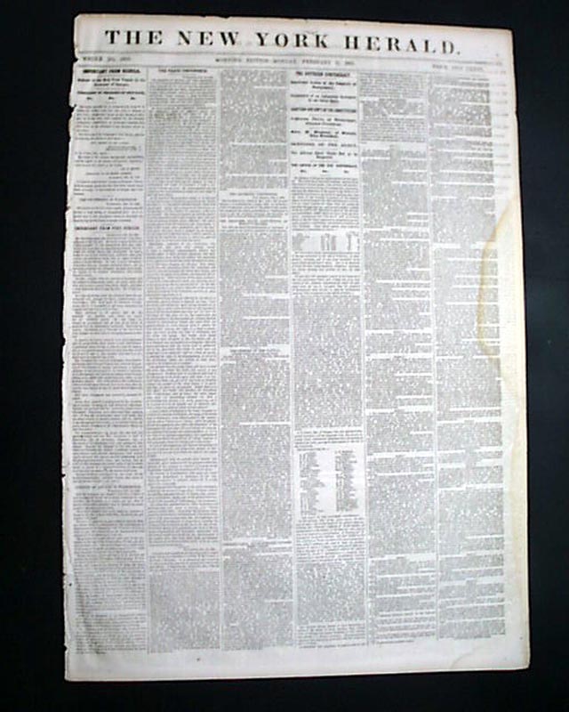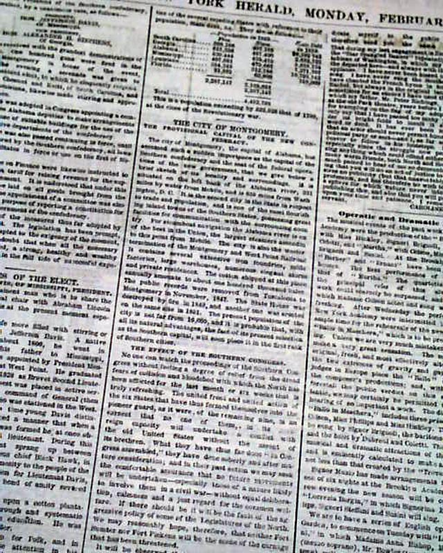 NEW YORK HERALD, Feb. 11, 1861 The top of the front page has: "The Southern Confederacy" "Important Action of the Congress at Montgomery" "Adoption & Copy of the Constitution" "Jefferson Davis, of Mississippi, Elected President" "Alex. H. Stephens, of Georgia, Vice President" "Sketches of the Elect" "The African Slave Trade Not to be Reopened" "The Capital of the New Confederacy".