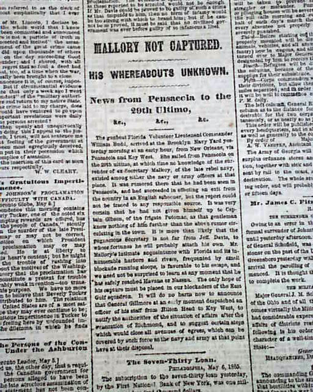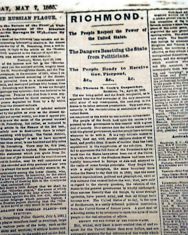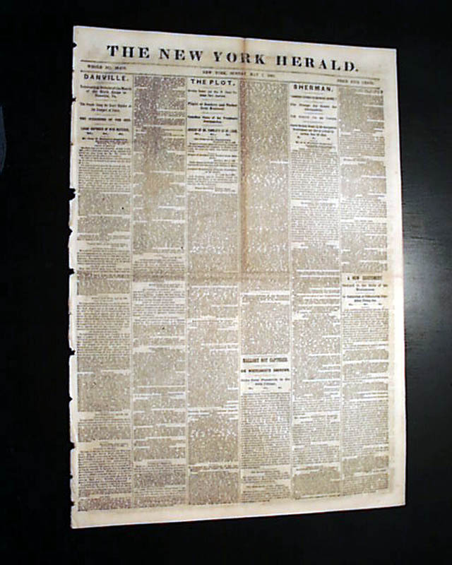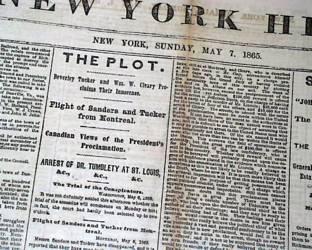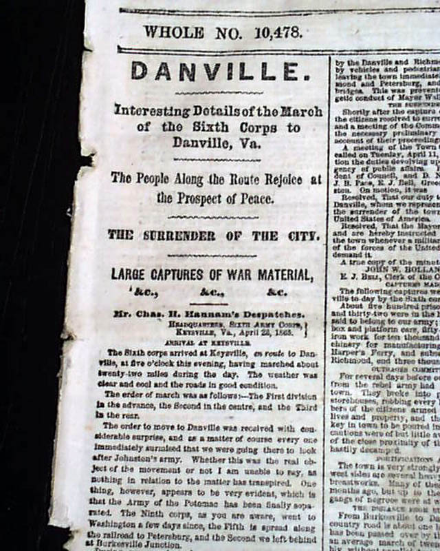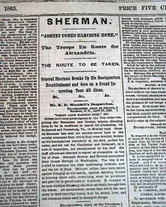 The front page has some nice column heads on the closing events of the Civil War including: "Danville" "Interesting Details of the March of the Sixth Corps to Danville, Va." "THE PLOT" "Flight of Sanders & Tucker from Montreal" "Canadian Views of the President's Proclamation" "SHERMAN" "Johnny Comes Marching Home" "The Troops En Route for Alexandria" and much more.