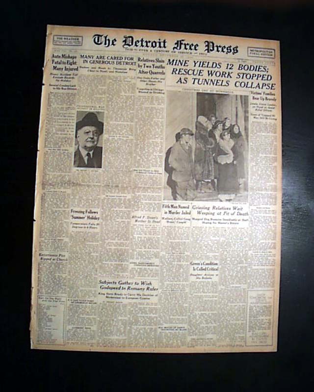 The top of the front page has a four column headline: "MINE YIELDS 12 BODIES; RESCUE WORK STOPPED AS TUNNELS COLLAPSE" with subheads and related photo. (see) First report coverage on the coal mine explosion disaster at Moweaqua, Illinois.