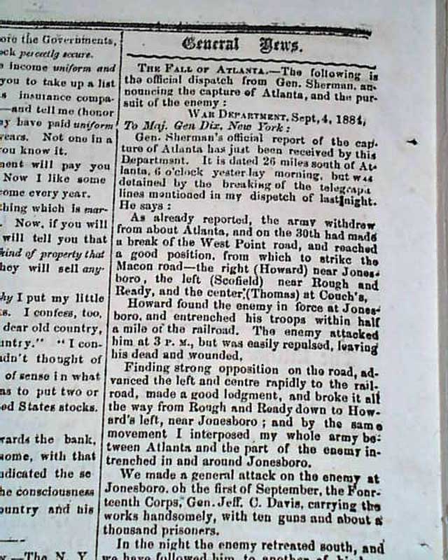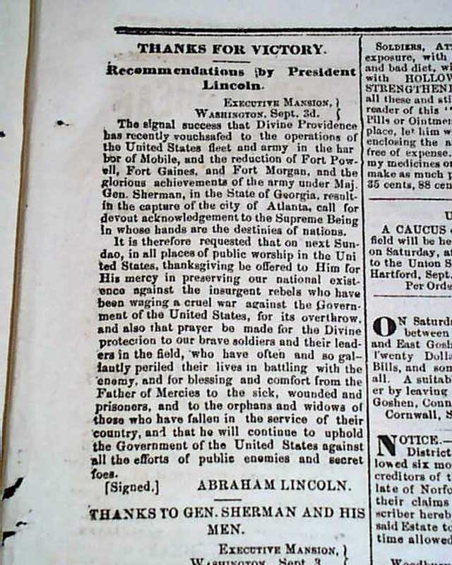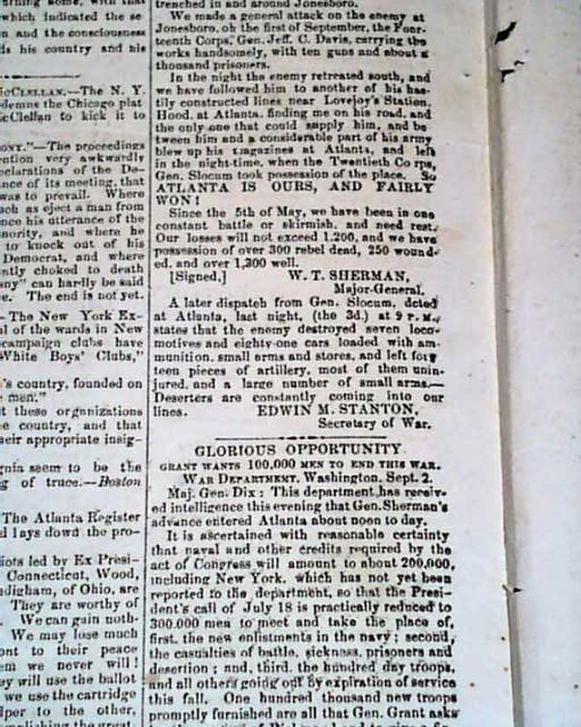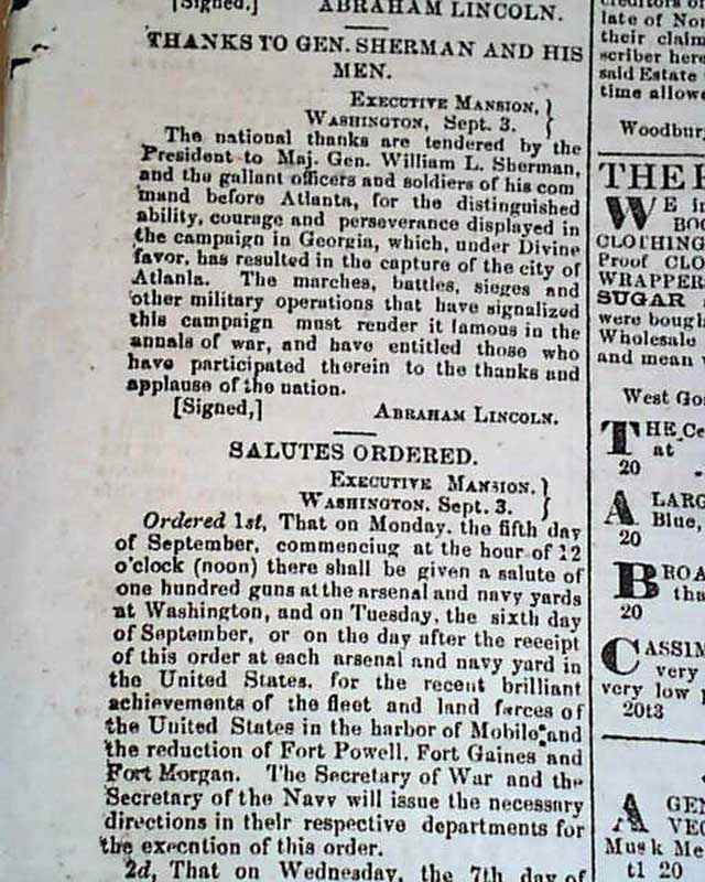Also inside is the official report of the: "Fall of Atlanta" by General Sherman, signed by him in type: W. T. Sherman. This is followed by: "Glorious Opportunity - Grant Wants 100,000 Men to End this War" signed in type by: Edwin Stanton, Sec. of War. Also "Thanks For Victory - Recommendations by President Lincoln" signed in type: Abraham Lincoln, followed by: "Thanks to Gen. Sherman & His Men" signed in type: Abraham Lincoln, and: "Salutes Ordered" signed in type: Abraham Lincoln, and then: "Thanks to Farragut & Candy" signed in type: Abraham Lincoln.