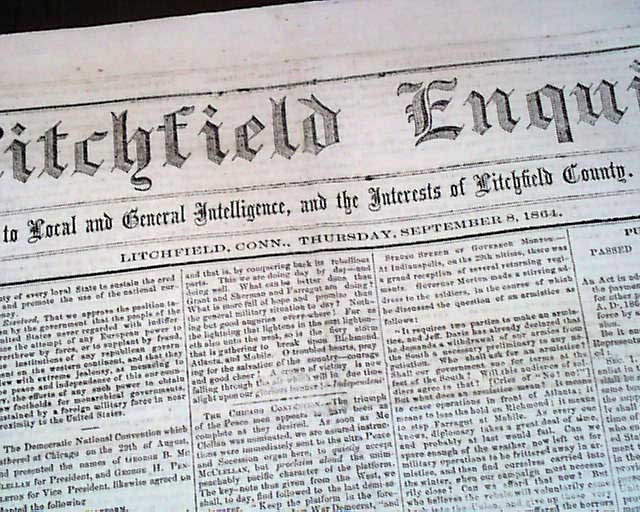 THE LITCHFIELD ENQUIRER, Connecticut, Sept. 8, 1864 Page 2 begins with a political notice in support of Abraham Lincoln for President.