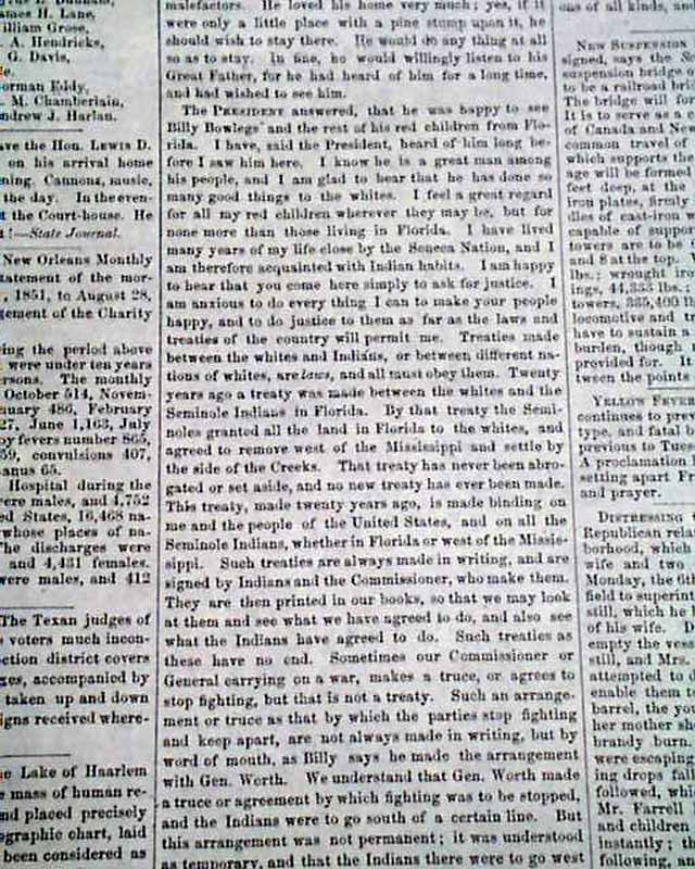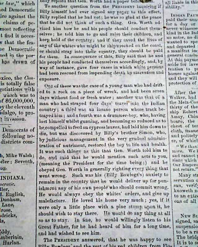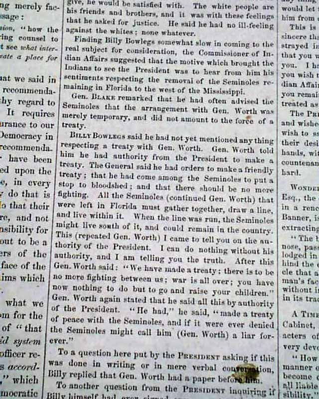 Page 3 has 1 1/3 columns taken up with: "Seminole Interview With the President" which has auction mention of Billy Bowlegs, the Seminole Indian Chief.