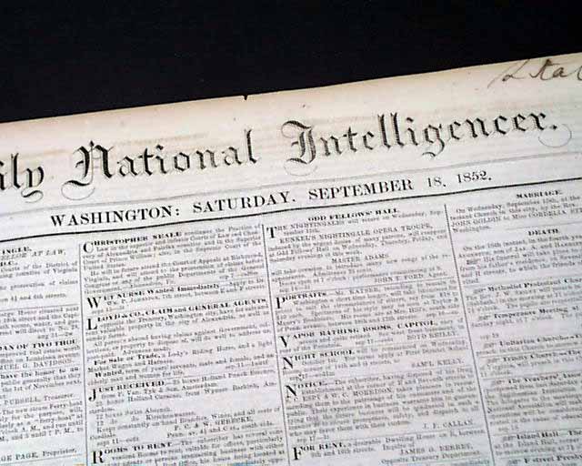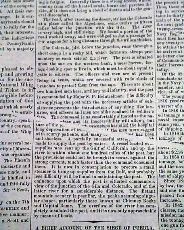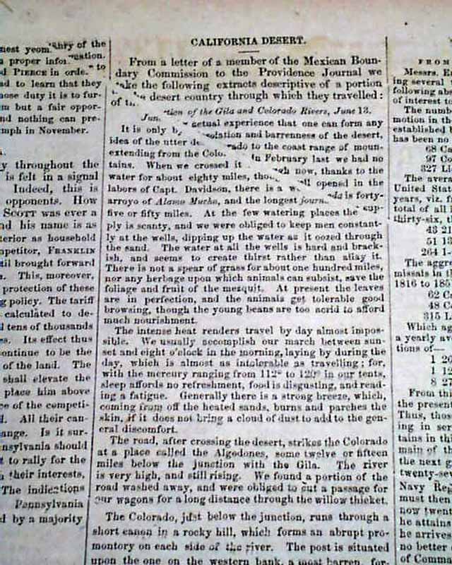 DAILY NATIONAL INTELLIGENCER, Washington, D.C., Sept. 18, 1852  Page 2 has nearly half a column with a very descriptive article headed: "California Desert", It is datelined from the junction of the Colorado and Gila Rivers, which would be west of Phoenix at the California border, but there is mention of Capitol Dome and other locations that would seem to include Northern Arizona and Utah, etc. (printing crease error here does not cause loss of any text).