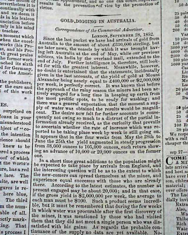 Page 3 has: "California" which is a fascinating letter on life in San Francisco, a few bits including: "...There is not the least doubt of this being the best country for a man to make money, provided he is frugal and industrious. Labor of every kind is well compensated...There are here a thousand temptations in the way of gaming, drinking, and loose riotous living...Rents are therefore enormous..." and so much more.