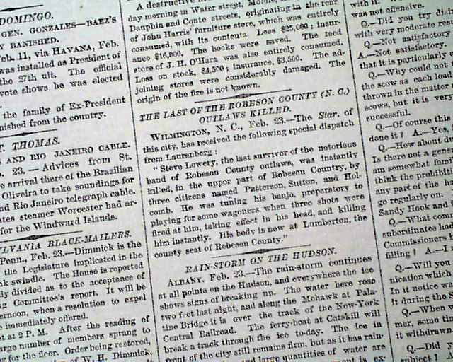 The front page has a brief yet notable article on the Lowry War in North Carolina: "The Last of the Robeson County (N.C.) Outlaws Killed", noting in part: "...Steve Lowery, the last survivor of the notorious band of Robeson County outlaws, was instantly killed...by three citizens...He was tuning his banjo...when three shots were fired...killing him instantly...".