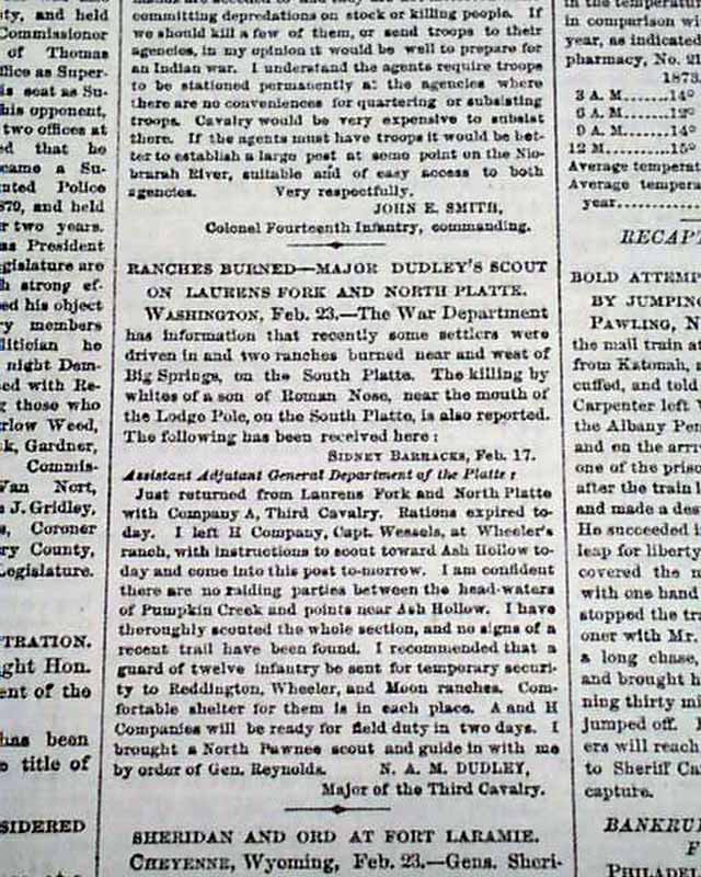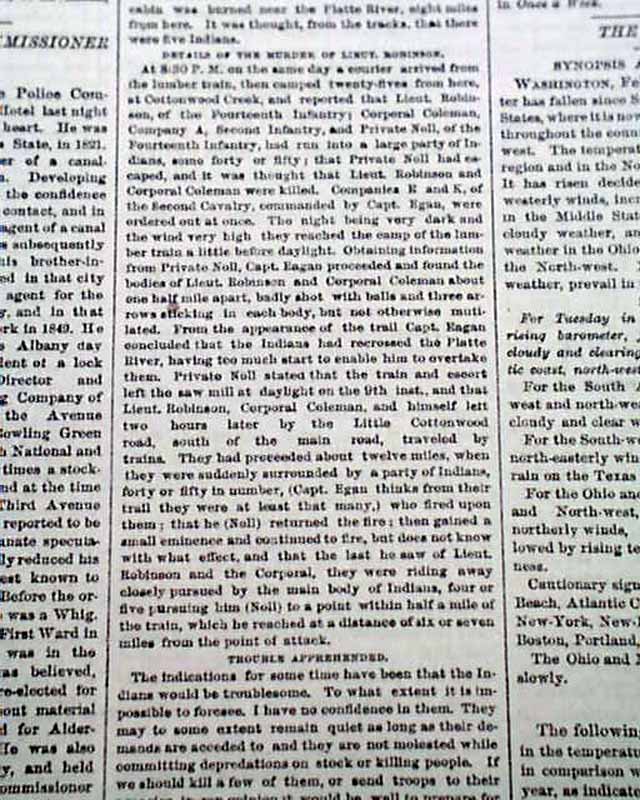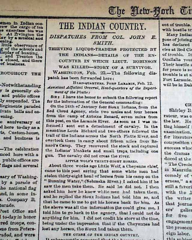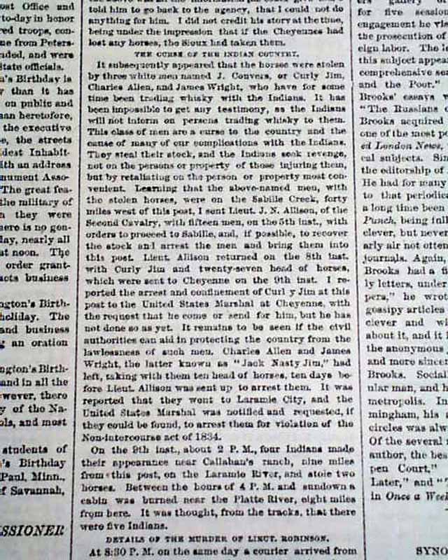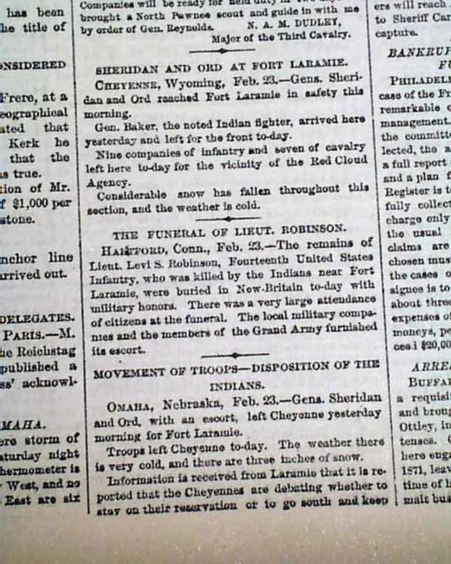 Page 3 has: "THE INDIAN COUNTRY" "Thieving Liquor Traders Protected by the Indians--Details of the Encounter in Which List. Robinson Was Killed--Story of a Survivor". Also: "Sheridan & Ors at Fort Laramie" "Movement of Troops--Disposition of the Indians" "Ranches Burned...".