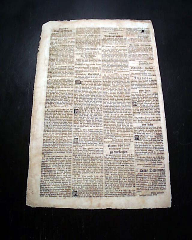 A quite scarce newspaper for the German speaking community in the Harrisburg area, printed entirely in the German language. Gregory's "Union List of American Newspapers" notes that only the Pennsylvania State Library has a reasonable run of this title, two other institutions having but a single issue.