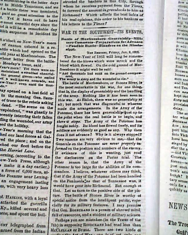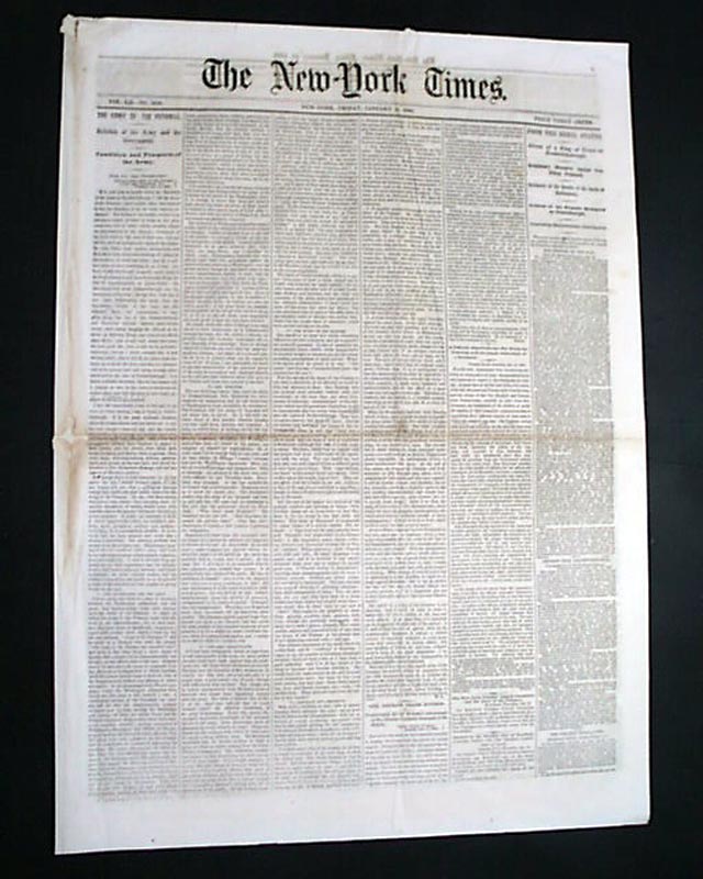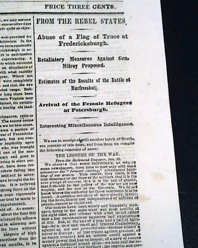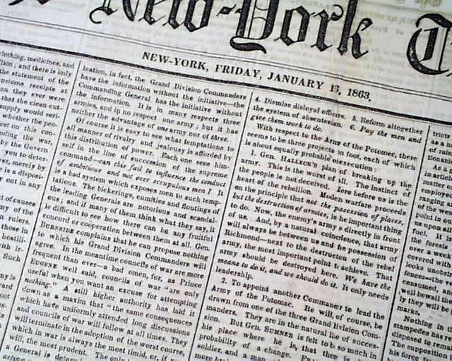 NEW YORK TIMES, Jan. 16, 1863 Among the front page one column heads on the Civil War are: "The Army Of The Potomac" "Condition & Prospects of the Army" "From The Rebel States" "Abuse of a Flag of Truce at Fredericksburgh" "Estimates of the Results of the Battle at Murfreesboro" and much more.