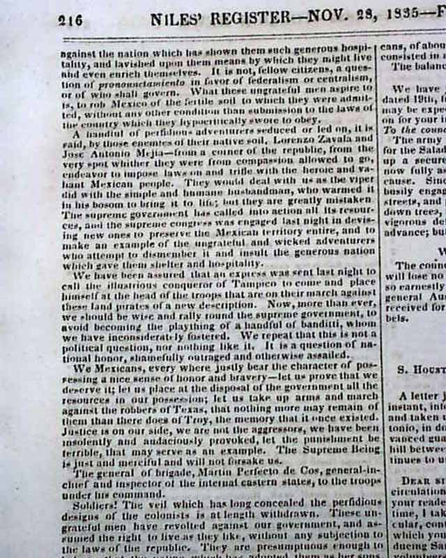 Inside has a report headed "Mexico" which includes: "...The tidings of the recent movements in Texas had reached the capitol & as to be expected, had produced a great excitement...every appearance that we shall soon hear of serious doings in the revolted province...A division of 2000 infantry had been ordered to assemble at Matamoras & 300 cavalry under general Montezuma had begun their march to Monterey in Texas. It was said that general Santa Anna himself would proceed thither to take the chief command..." and also: "The colonists of Texas have revolted against the supreme government, or to speak more correctly against the nation which has shown them such generous hospitality & lavished upon them means by which they might live & even enrich themselves..." with more including a letter signed: Martin Perfecto de Cos, a Mexican military general.