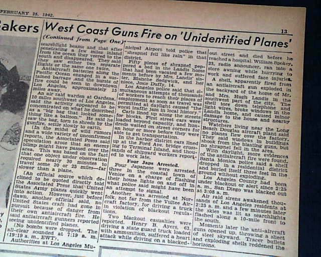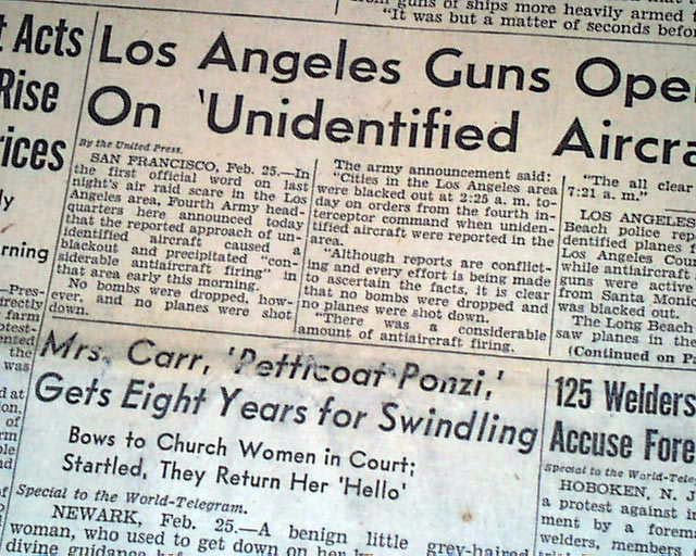 Here is a report on what is known as the "Battle of Los Angeles". The front page has a three column heading: "Los Angeles Guns Open Up On 'Unidentified Aircraft'"