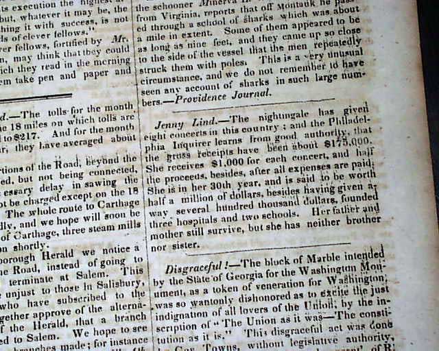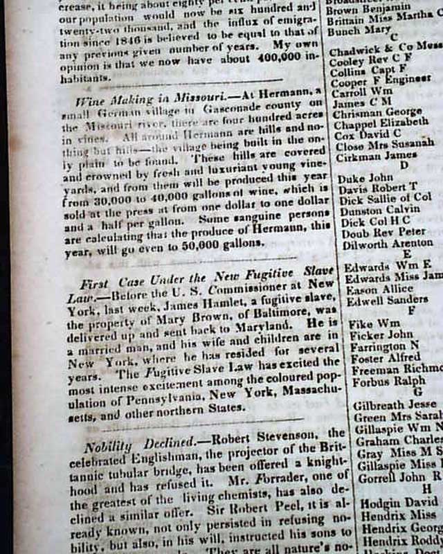 Page 3 has an article on: "Jenny Lind", called the Swedish Nightingale. but of most significance is the back page report: "First Case Under the New Fugitive Slave Law" which reports on the case of James Hamlet. He was the first slave returned to slavery under the Fugitive Slave Act of 1850, occurring just 8 days after the passage of the new law.