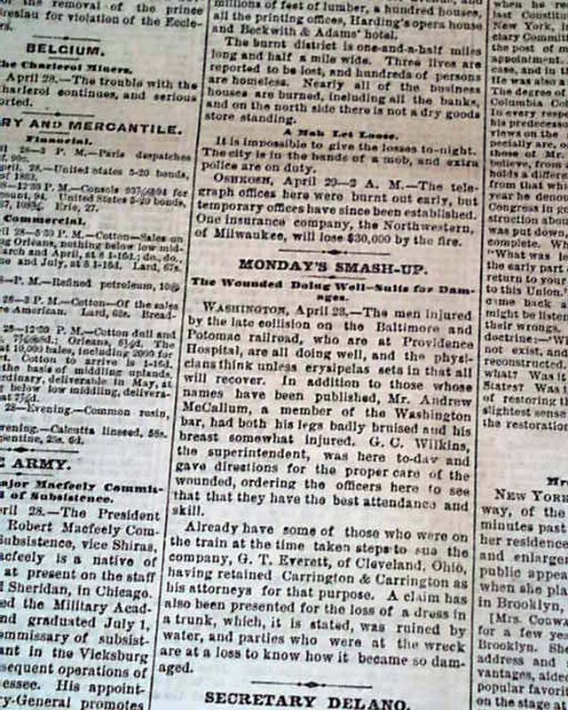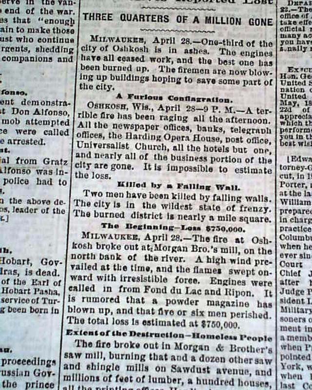 The top of the front page has one column headings that include: "A BURNING CITY" "Oshkosh In Flames" "Extensive Destruction of Business Houses" "Hundreds Of People Homeless" and more. (see)