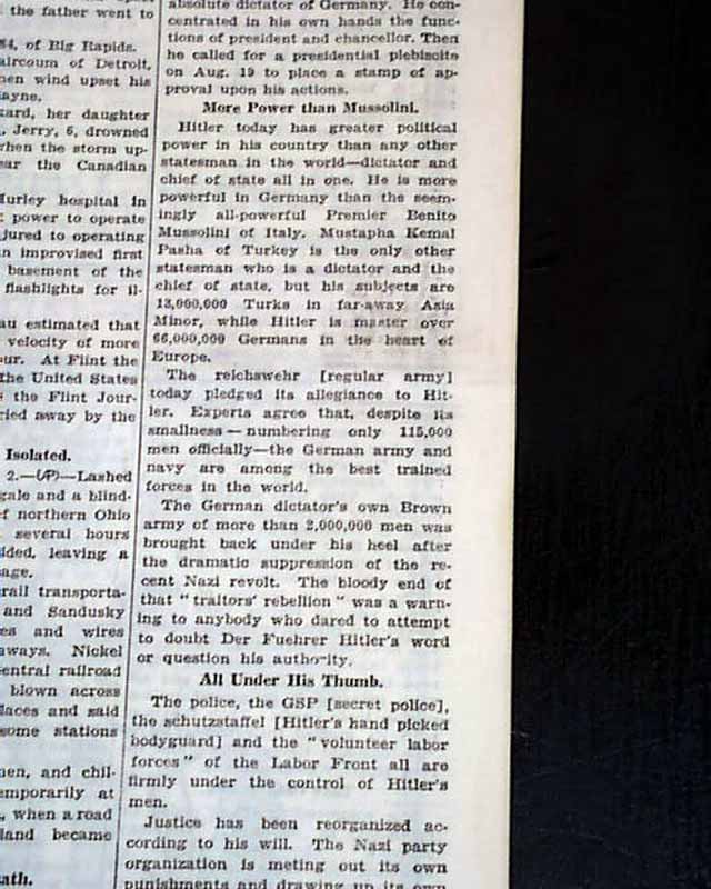 Among the reports inside: "Europe Worries On Future With Hitler At Helm". Part of the back page banner headline announces: "Hitler Seizes All Power as Germany Mourns Death of President Hindenburg...". The entire bkpg. is taken up with photos, six of which are about Hitler.