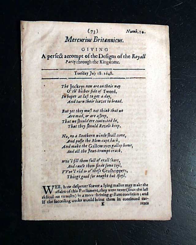 MERCURIUS BRITANNICUS Giving A Perfect Accept of the Designs of the Royal Party Through the Kingdome, London, July 18, 1648