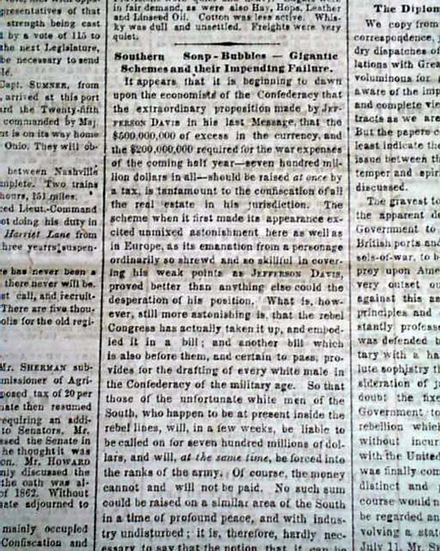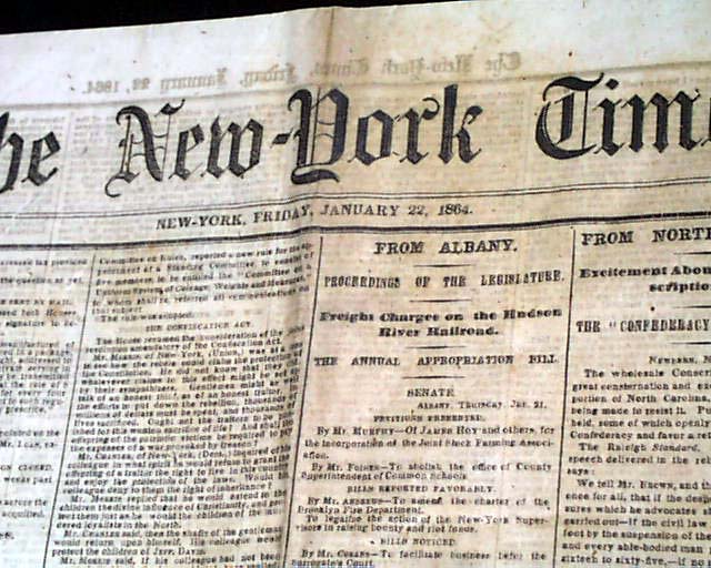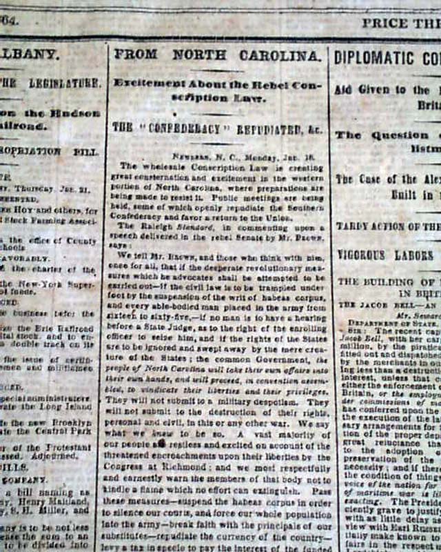 NEW YORK TIMES, Jan. 22, 1864 Among the front page column heads on the Civil War are: "The Oath of Allegiance Still Before the Senate" "All Cotton to be Taxed Two Cents Per Pound" "Clothing Packages for Soldiers Can be Sent by Mail" "From North Carolina' "Excitement About the Rebel Conscription Law' "The 'Confederacy' Repudiated" "Aid Given to the Rebellion by Great Britain" and more.