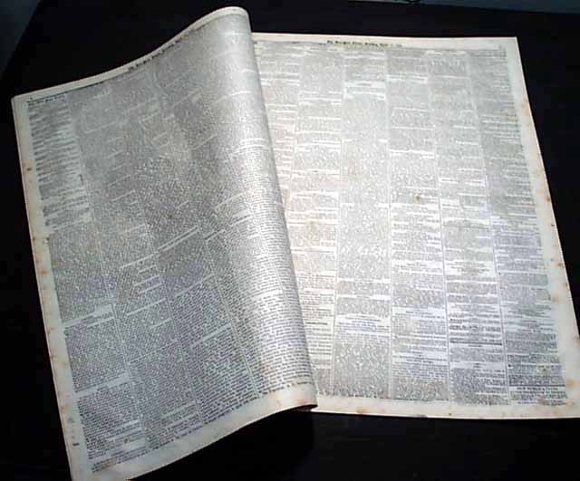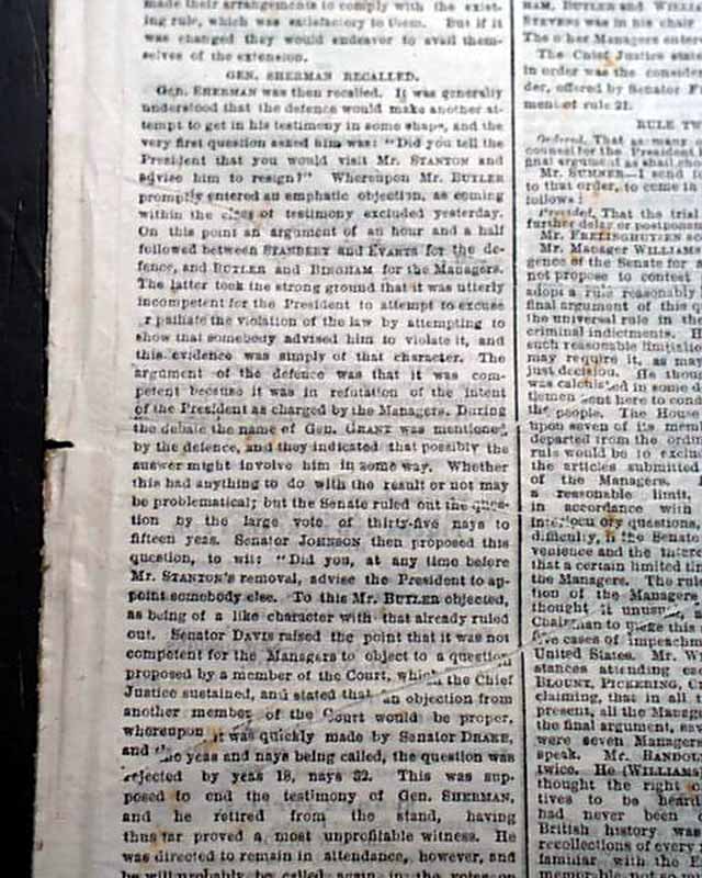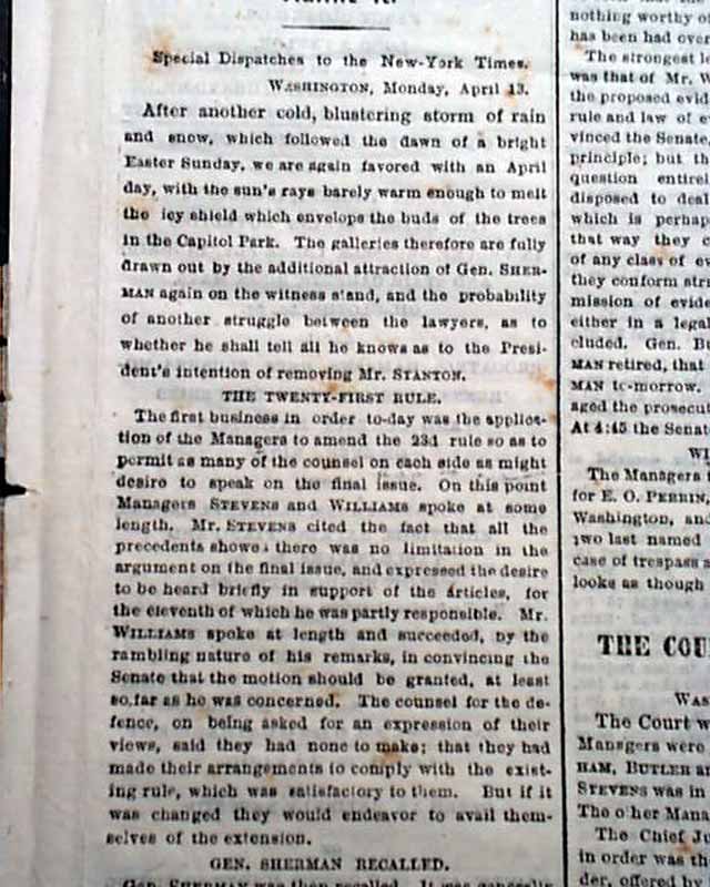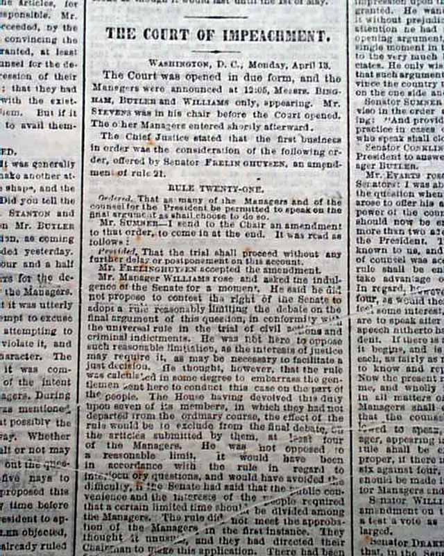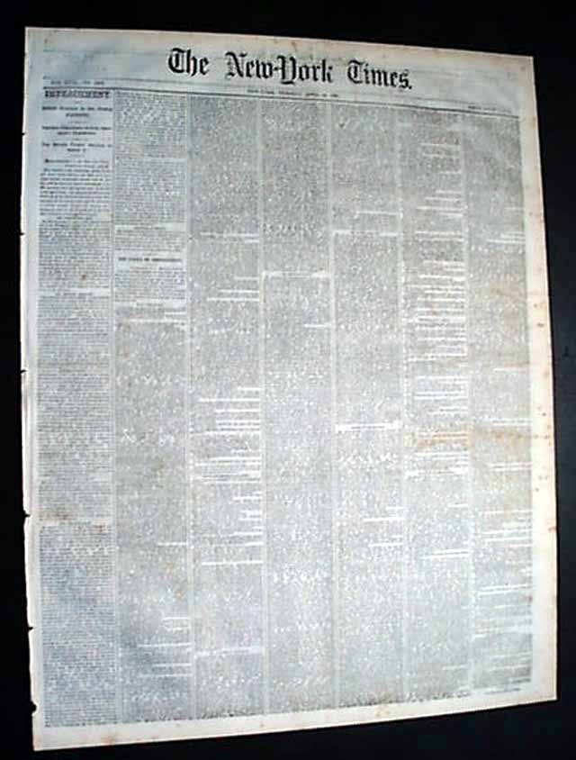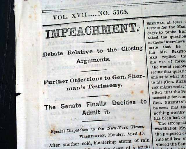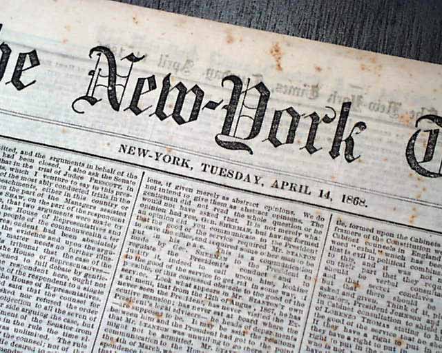 NEW YORK TIMES, April 14, 1868 The entire front page and close to half of the back page are taken up with reports on Andrew Johnson's impeachment trial, much of it verbatim testimony. The column heads include: "IMPEACHMENT" "Debate Relative to the Closing Arguments" 'Further Objections to Gen. Sherman's Testimony" "The Senate Finally Decides to Admit It" "The Court Of Impeachment" and more.
