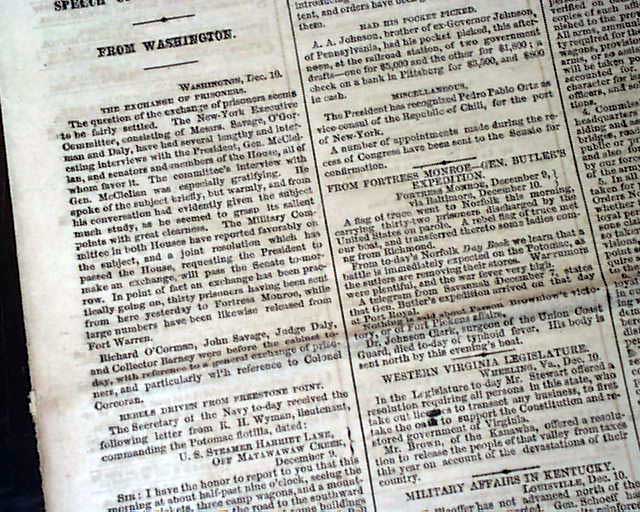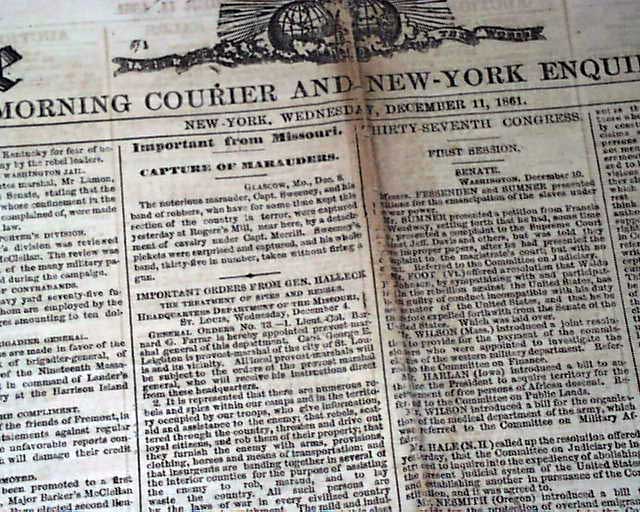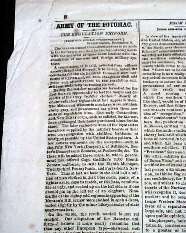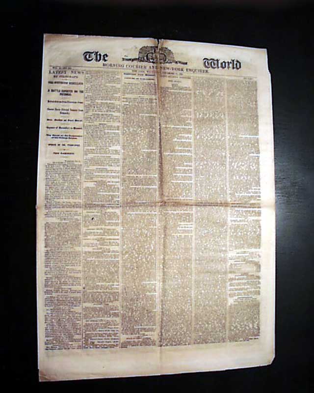 THE WORLD, New York, Dec. 11, 1861 Nice front page column heads on the Civil War include: "The Southern Rebellion" "Battle Expected on the Potomac" "Rebels Driven from Freestone Point" "Capture of Marauders in Missouri" "Garret Davis Elected Senator from Kentucky" and more.