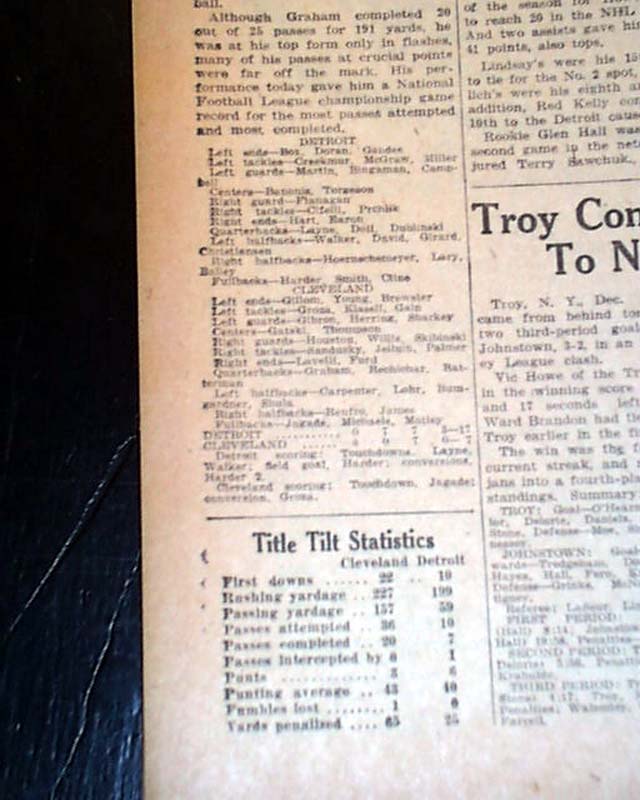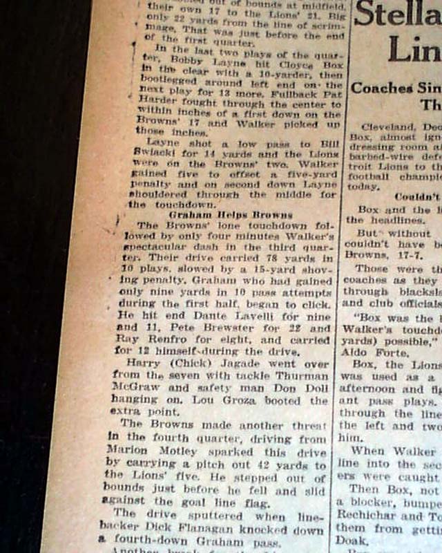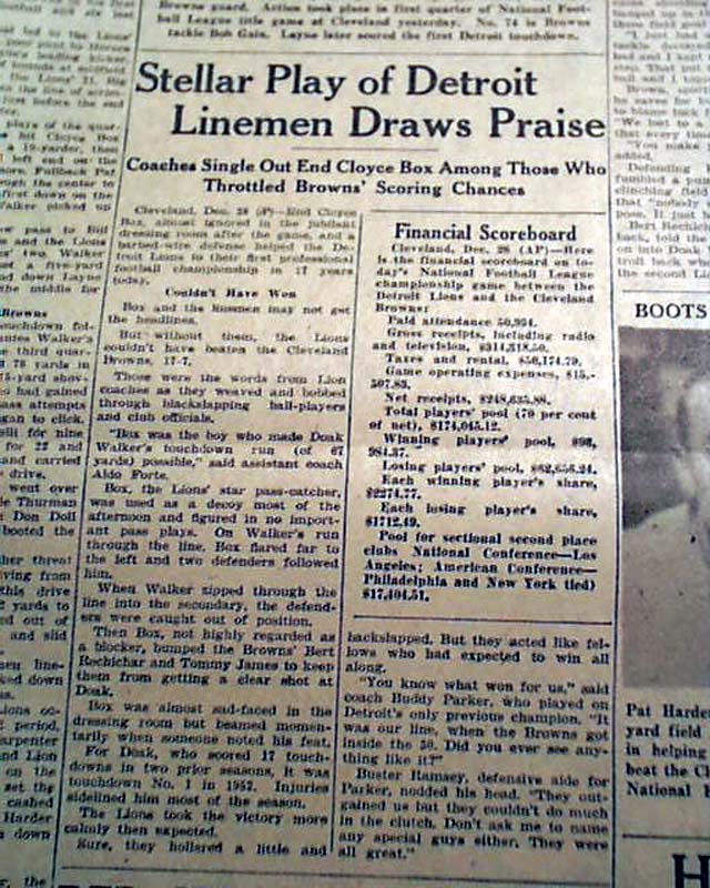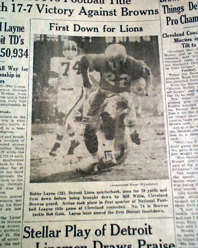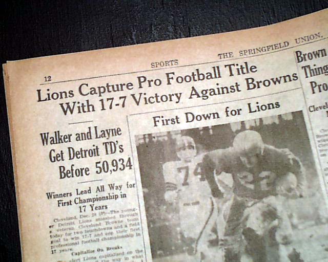 The top of page 12 (sports) has a three column heading: "Lions Capture Pro Football Title With 17-7 Victory Against Browns" with subheads, lineups, stats and related photo. (see)