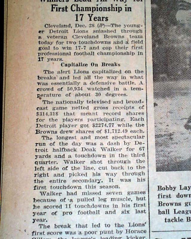Detroit Lions win NFL football championship against Cleveland Browns...