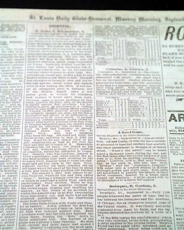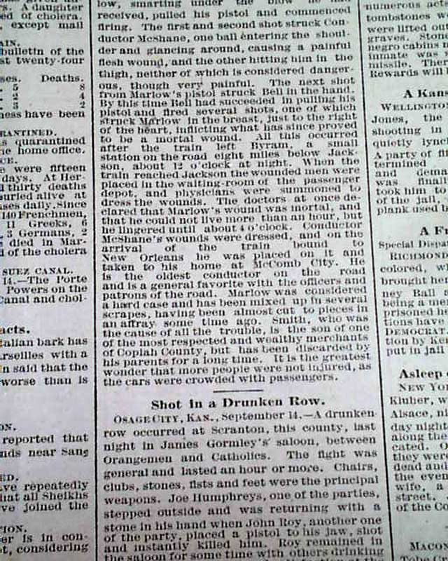 ST. LOUIS GLOBE-DEMOCRAT, Sept. 15, 1884 The front page has a nearly half-column article: "Criminal Calendar" "Fatal Shooting Affray on a Passenger Train" with much detail.