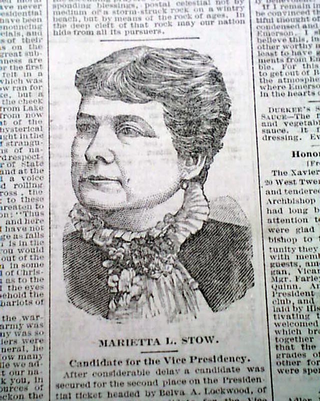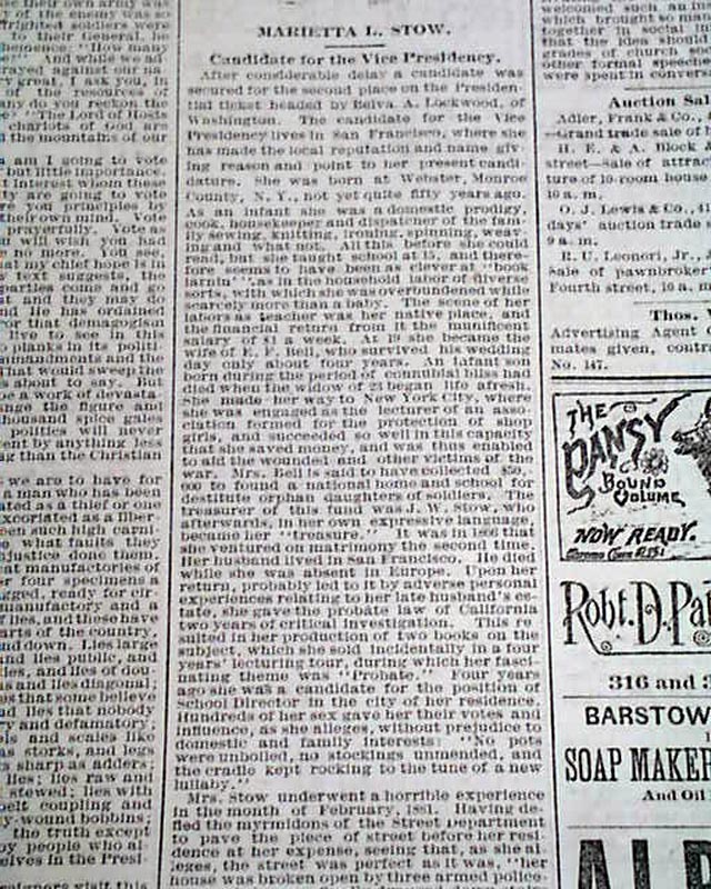Page 5 has a print of: "Marietta L Stow" with a one-third column article on he headed: "Candidate for the Vice Presidency".