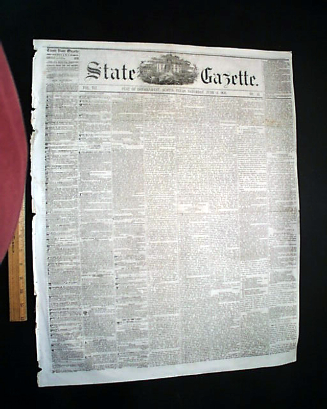 STATE GAZETTE, "Seat of Government" Austin, Texas, June 14, 1856  We rarely are able to offer newspapers from Texas from before the Civil War. This is one.