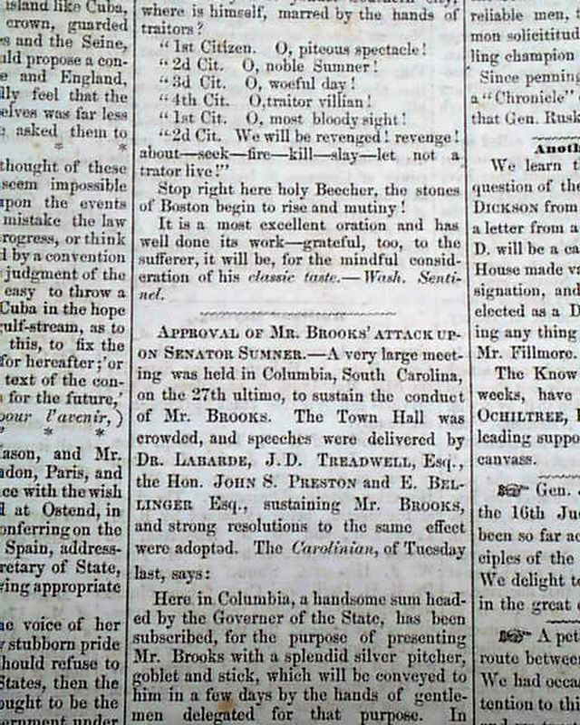Inside has content concerning the Books/Sumner affair, where Brooks attacked Sumner over comments concerning the Kansas-Nebraska Act. Also: "Democracy of Lamar" "Nicaragua--Cheering News!" "Texas Western Railroad" and other items, much of it political.