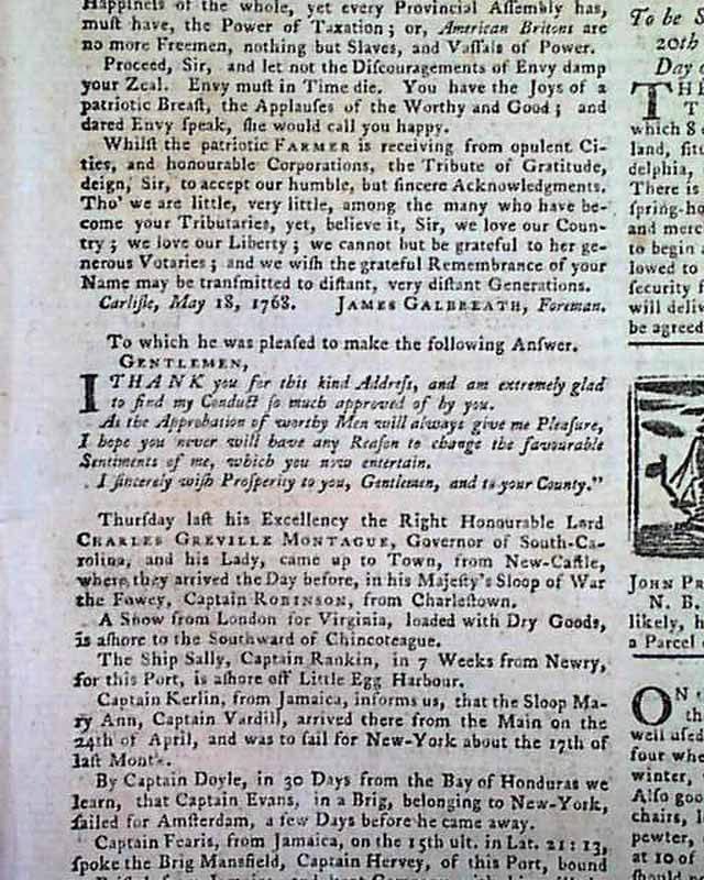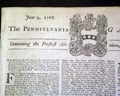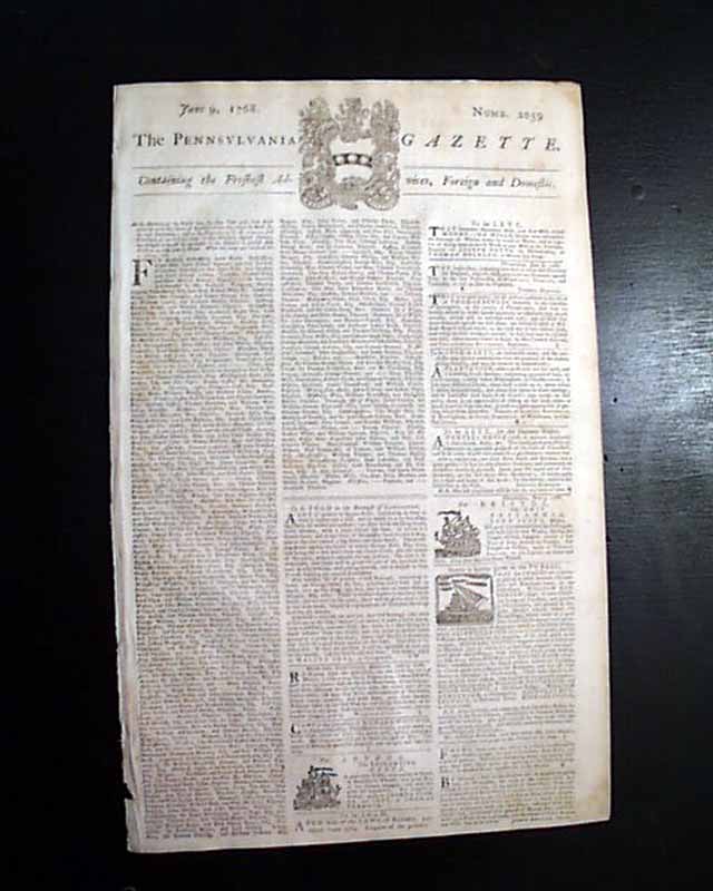 THE PENNSYLVANIA GAZETTE, Philadelphia, June 9, 1768 This was the newspaper made famous by Ben Franklin, as he was the published (and his name appeared in the imprint) through 1765. The masthead features a very detailed engraving of the then Pennsylvania coat-of-arms.