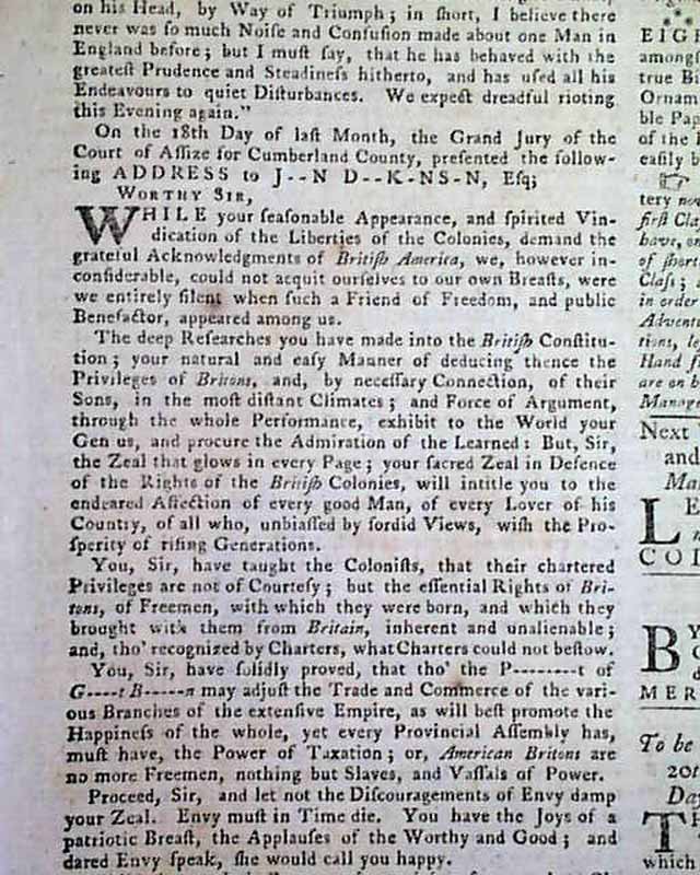 Page 3 has an address to John Dickinson mentioning in part: "While your seasonable appearance & spirited vindication of the Liberties of the Colonies demand the grateful acknowledgments of British America..." with much more. This is followed by his brief response.