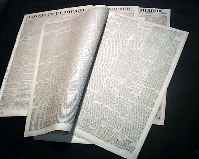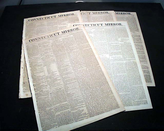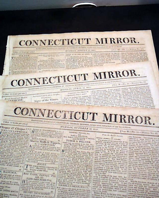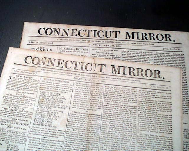 CONNECTICUT MIRROR, Hartford. A lot of five newspapers dated March 19, April 16, Oct. 15, 1810; April 15, Aug. 19, 1811. Each issue is complete in four pages, & in very nice condition with a wealth of varied news reports and ads of the day.