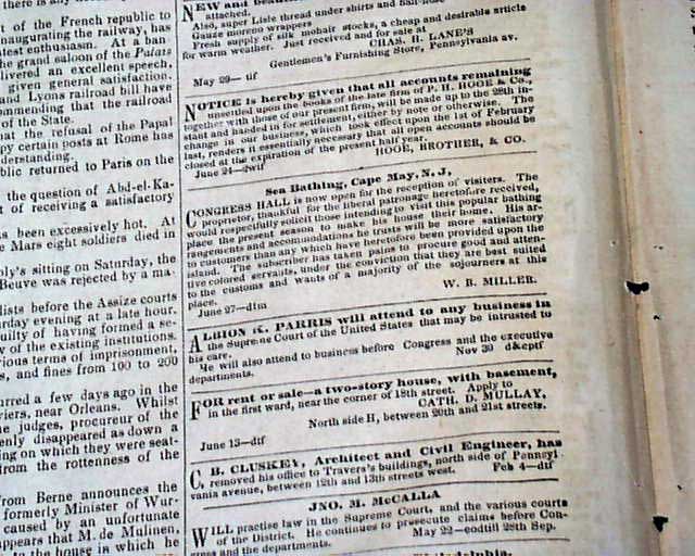 Among the advertisements on page 2 is one for the Congress Hall Hotel, headed: "Sea Bathing, Cape May, N.J." and beginning: "Congress Hall is now open for the reception of visitors..." with various detail.