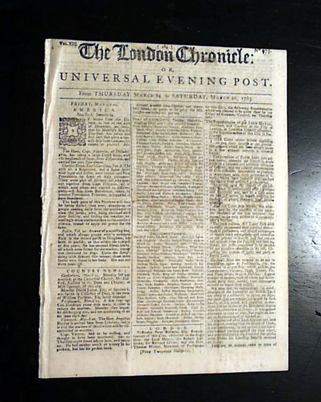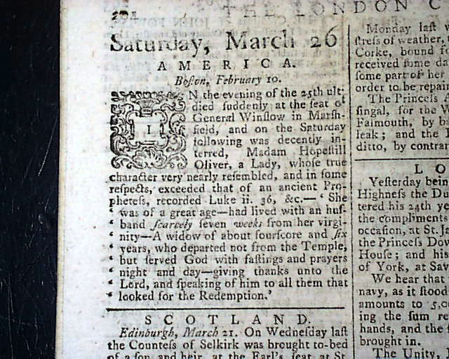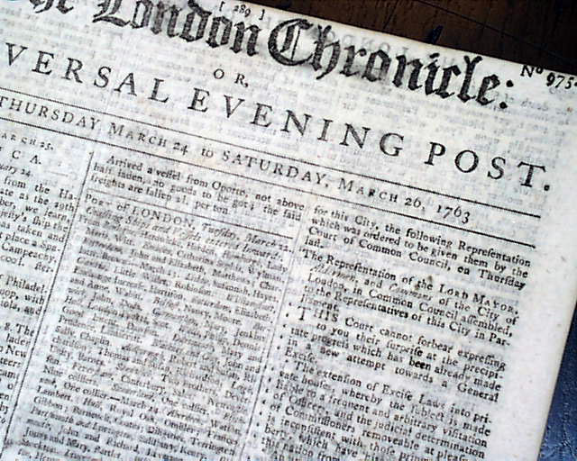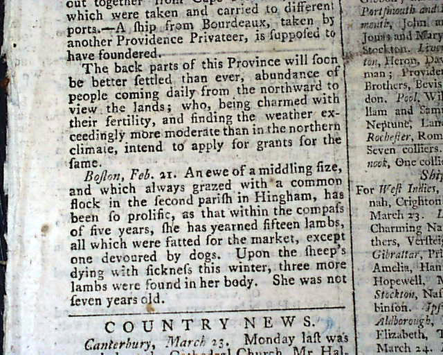 THE LONDON CHRONICLE, England, March 26, 1763 The front page has over half a column headed: "America" with datelines from New York, Charleston, and Boston. The Charleston account includes; "...The back part of this Province [South Carolina] will soon be better settled than ever, abundance of people coming daily from the northward to view the lands; who, being charmed with their fertility, and finding the weather exceedingly more moderate than in the northern climate, intend to apply for grants for the same."