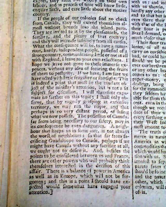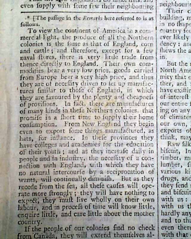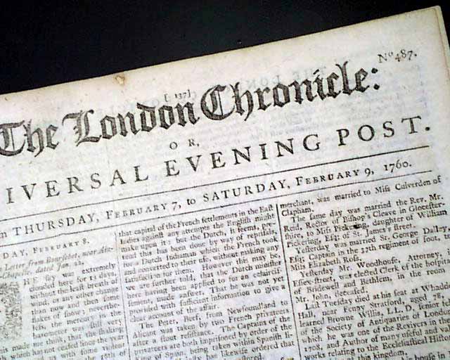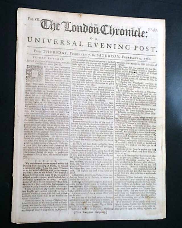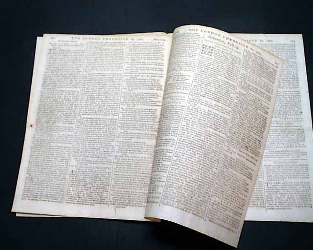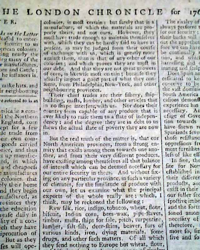 THE LONDON CHRONICLE, England, Feb. 9, 1760 Most of page 7 is taken up with an interesting analysis of the economy of the American colonies. It begins: "To view the continent of America oil a commercial light, the produce of all the Northern colonies is the same as that of England..." with so much more.