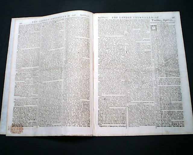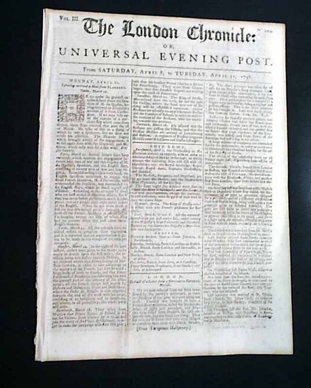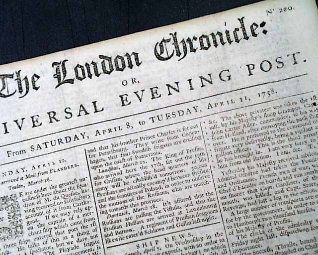 THE LONDON CHRONICLE, England, April 11, 1758 Page 6 has over half a column of reporting headed: "America" with two Charleston datelines, reporting on the French & Indian War.