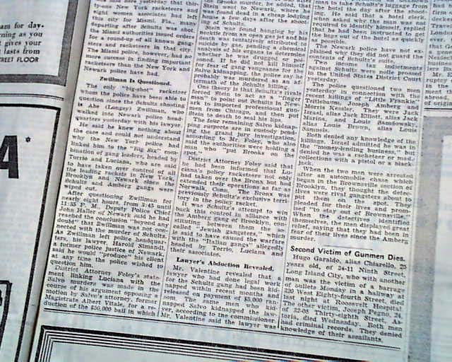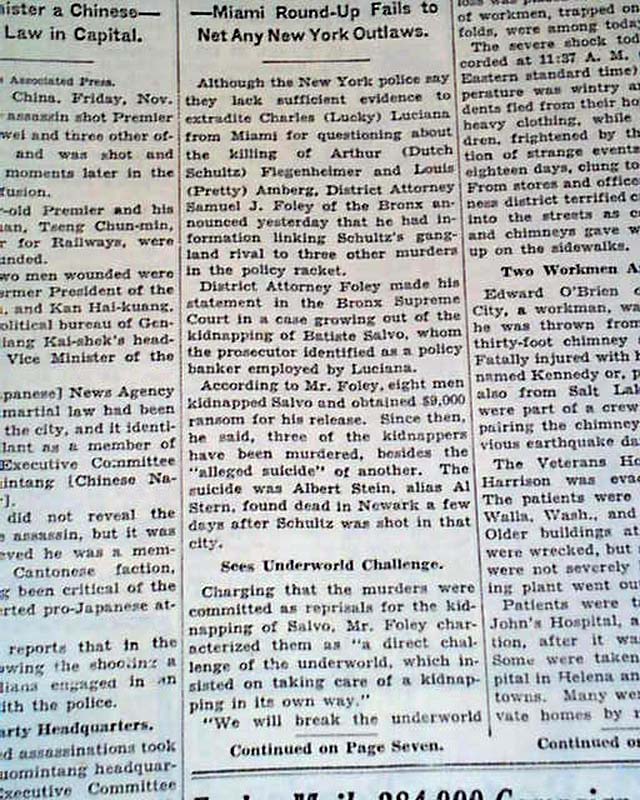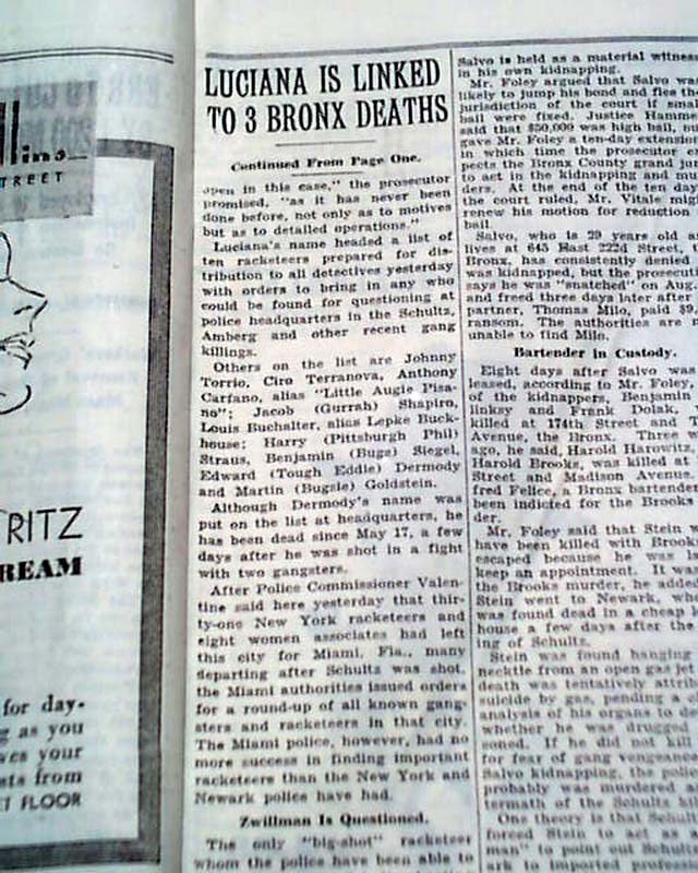 The front page has a one column heading: "LUCIANA IS LINKED TO 3 BRONX DEATHS; GANG LIST ISSUED" with subheads. (see) Was he responsible for the recent murder of fellow NYC gangster Dutch Schultz ?