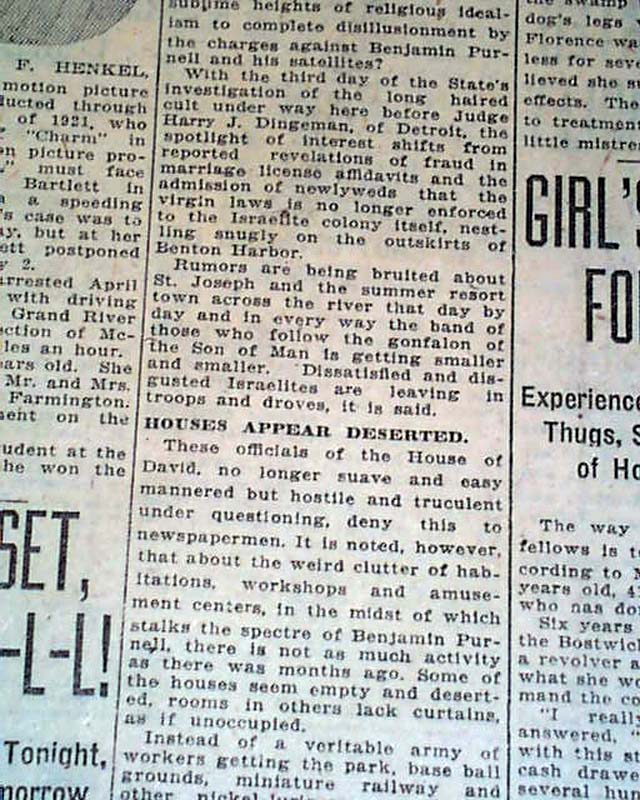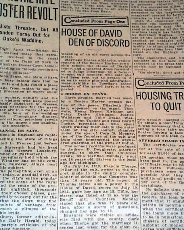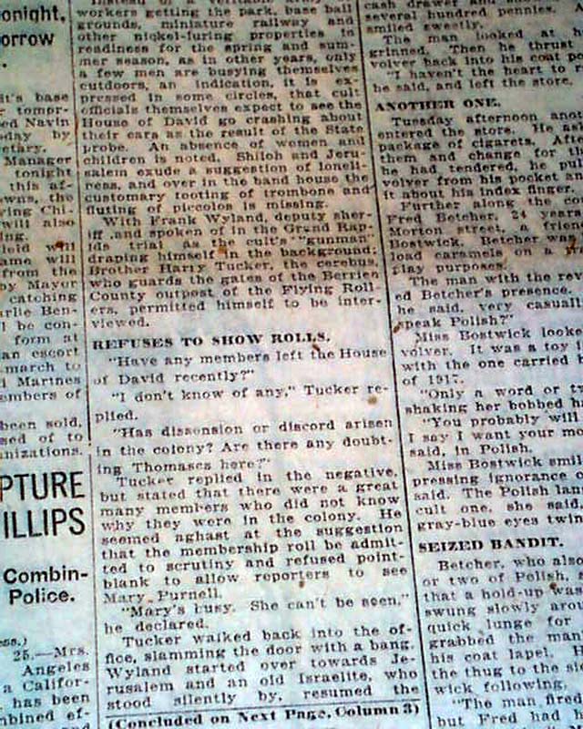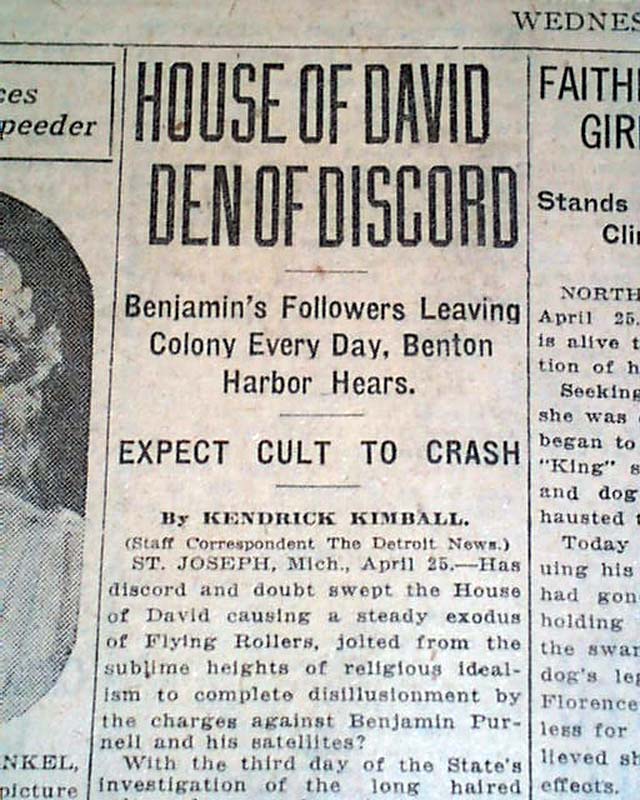 The top of the front page has a one column heading: "HOUSE OF DAVID DEN OF DISCORD" with subheads. (see) I suspect this to be an extremely rare item because their was really no reason to save it at the time.