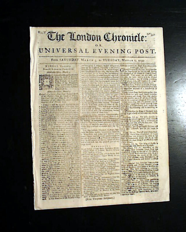 THE LONDON CHRONICLE, England, March 6, 1759 Page 2 has a report headed: "America" with Boston, Halifax, and New York datelines. One report notes a French frigate: "...went into Monto Christo & burnt and destroyed 14 sail of English vessels that were loading at that place for different ports in North America."