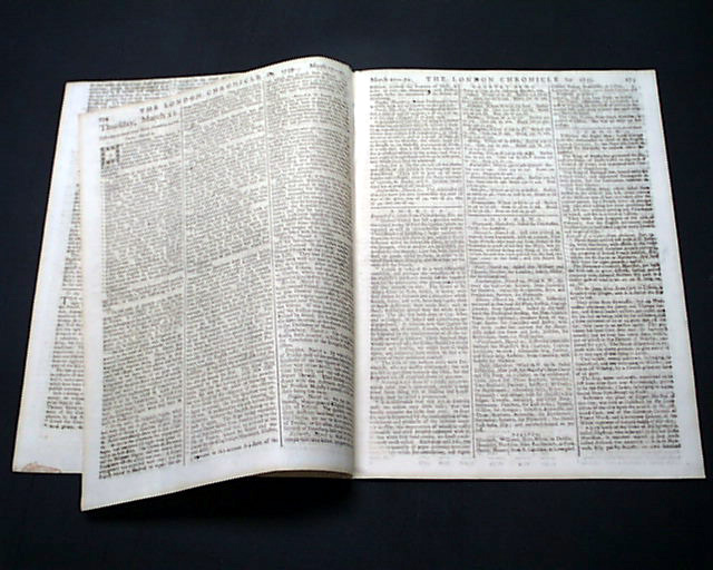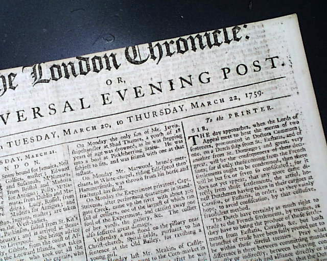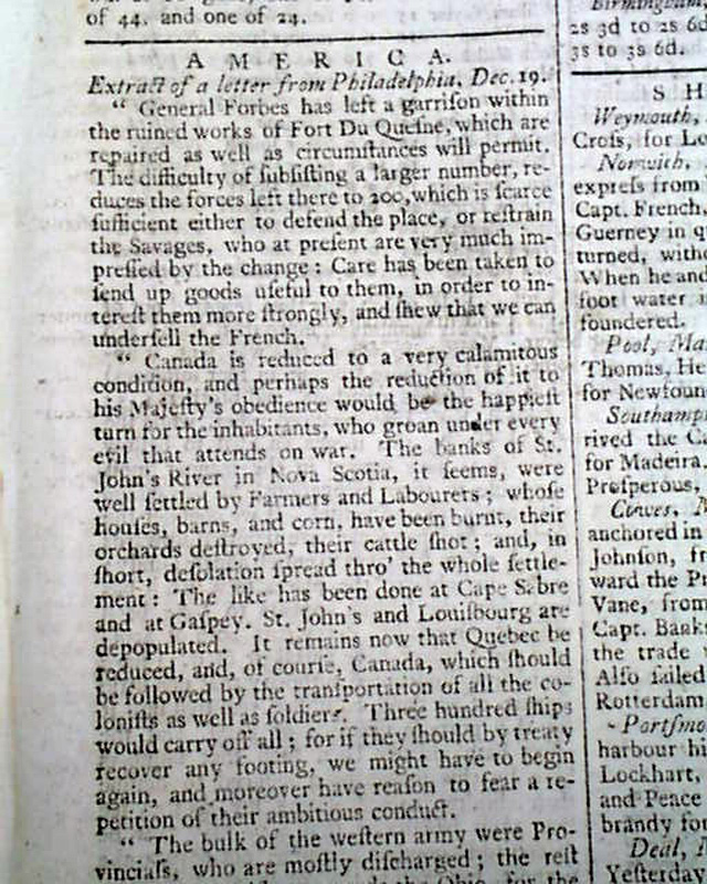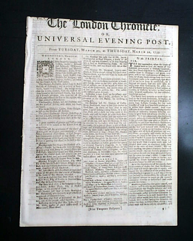 THE LONDON CHRONICLE, England, March 22, 1759 Page 5 has reports headed: "America" containing an: "Extract of a Letter from Philadelphia".