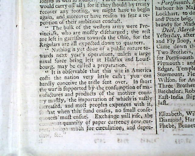 Also: "Canada is reduced to a very calamitous condition..." with much on the situation in Canada. And further on: "...It is observable that this war in America sorts the nation very little cash...In short the war is supported by the consumption of manufactures & products of the mother country..." with more.
