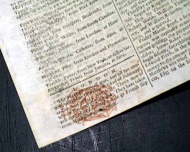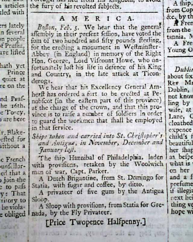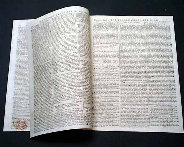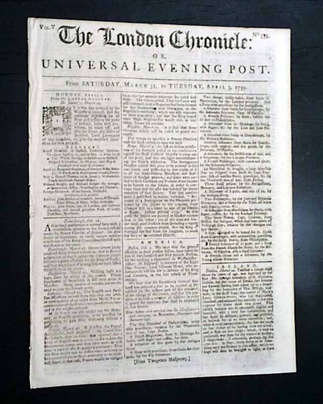 THE LONDON CHRONICLE, England, April 3, 1759 The front page has news reports headed: "America" which includes an item from Boston that: "...the General Assembly... voted the sum of 250 pounds sterling for the erecting a monument in Westminster Abbey in memory of the Right Hon. George, Lord Viscount Howe, who unfortunately lost his life in defence of his King and country in the late attack at Ticonderoga."