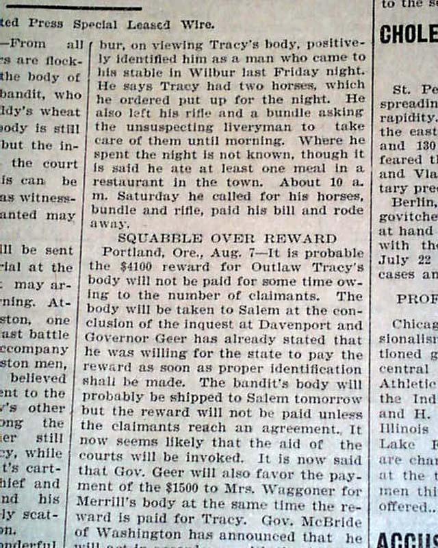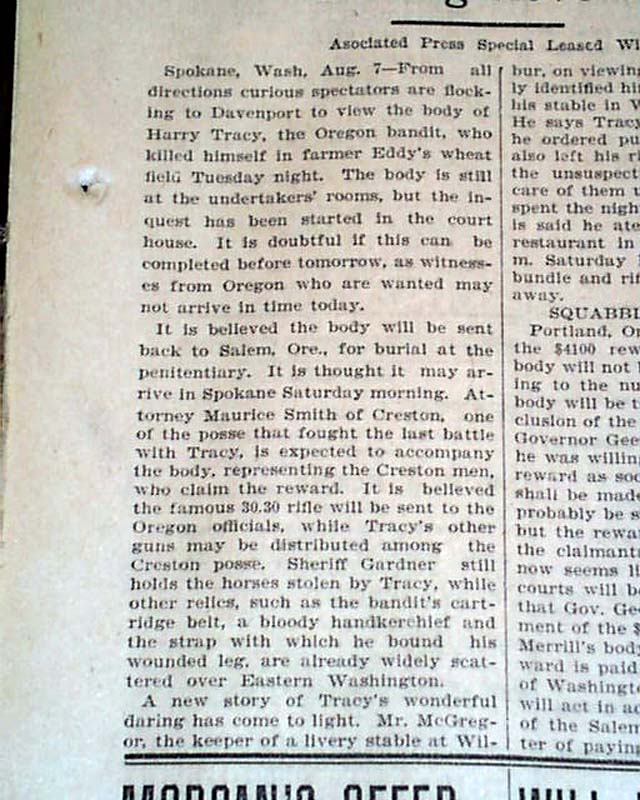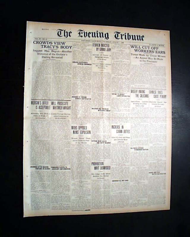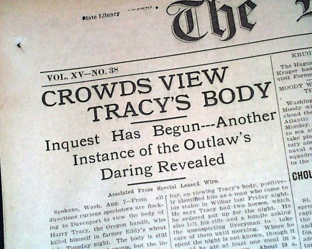 The top of the front page has a two column heading: "CROWDS VIEW TRACY'S BODY" with subhead. (see) Harry Tracy was an outlaw from the closing days of the Old West and is said to have run with Butch Cassidy & the Hole In The Wall Gang. Surprisingly this issue is in good condition being from the "wood pulp" era. Very hard to find issues that are not totally fragile from this era in paper.