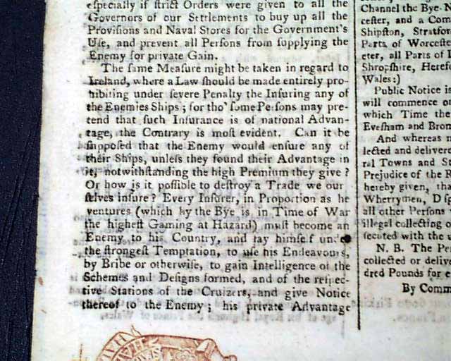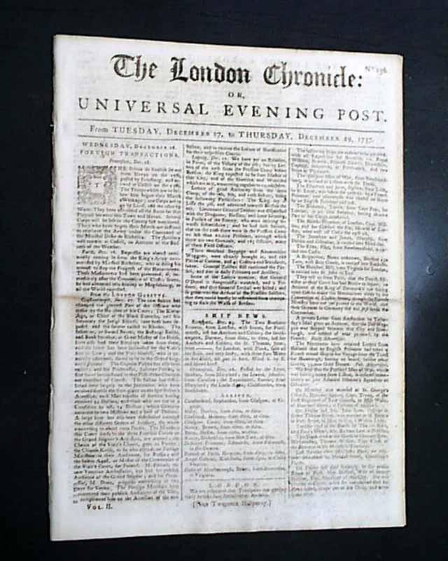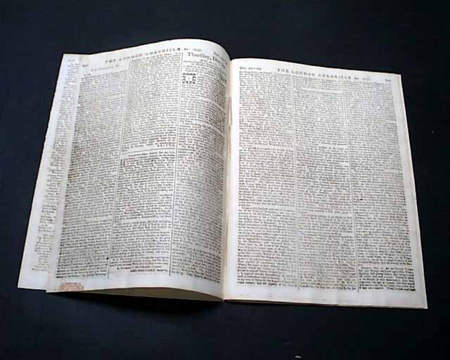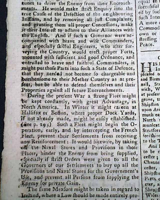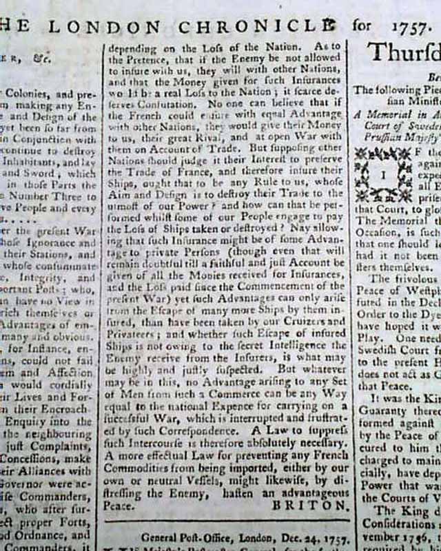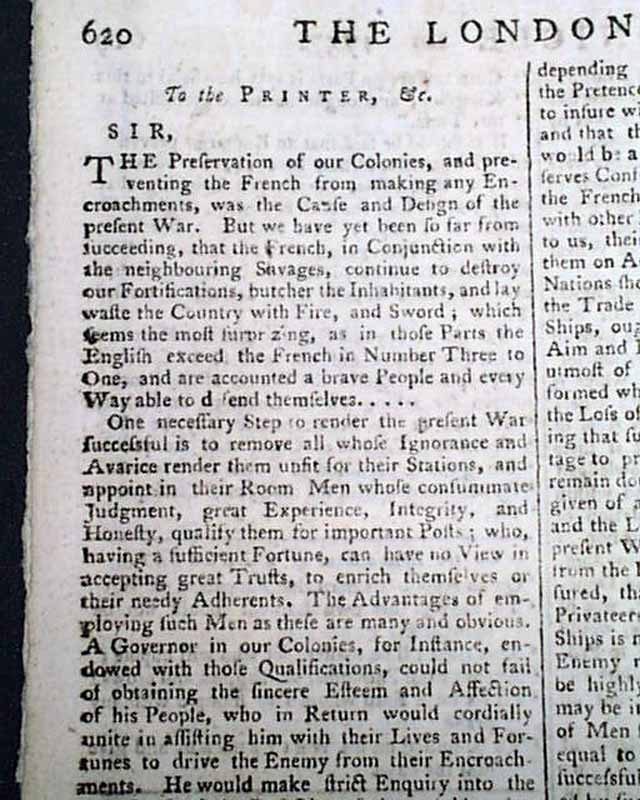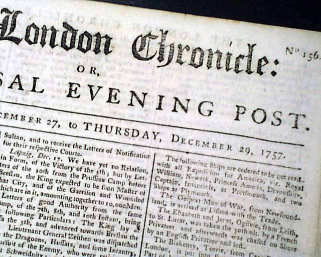 THE LONDON CHRONICLE, England, Dec. 29, 1757 Fully half of page 4 is taken up with a fine letter regarding the on-going French & Indian War. It begins: "The preservation of our Colonies and preventing the French from making any encroachments was the cause and design of the present war. But we have yet been so far from succeeding that the French, in conjunction with the neighboring savages, continue to destroy our fortifications, butcher the inhabitants..." with much more.