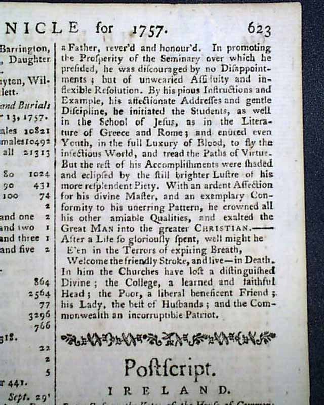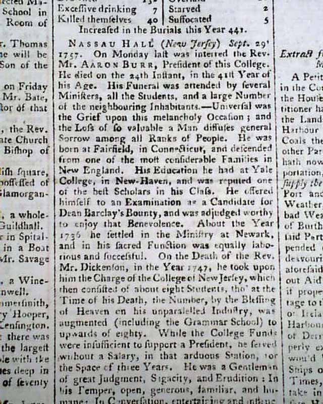 Page 7 has nearly a full column concerning the recent death of Reverend Aaron Burr, President of Princeton College, with much on his life, etc.