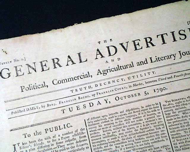 THE GENERAL ADVERTISER, Philadelphia, Oct. 5, 1790 A very early issue of this title which existed from 1790 - 1794 before being retitled "Aurora General Advertiser". It was printed by Benjamin Franklin Bache, Ben's grandson. It began just 4 days previous on October 1, this being "Daily No. 4".