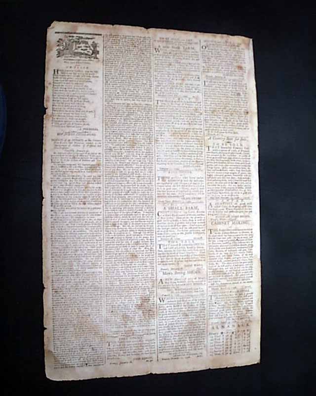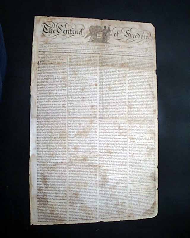 THE SENTINEL OF FREEDOM, Newark, New Jersey, Feb. 19, 1799 As any collector knows 18th century newspapers from New Jersey are very few & far between. Our records seem to indicate we've not previously offered an 18th century issue of this title before (and just one of the 19th century).