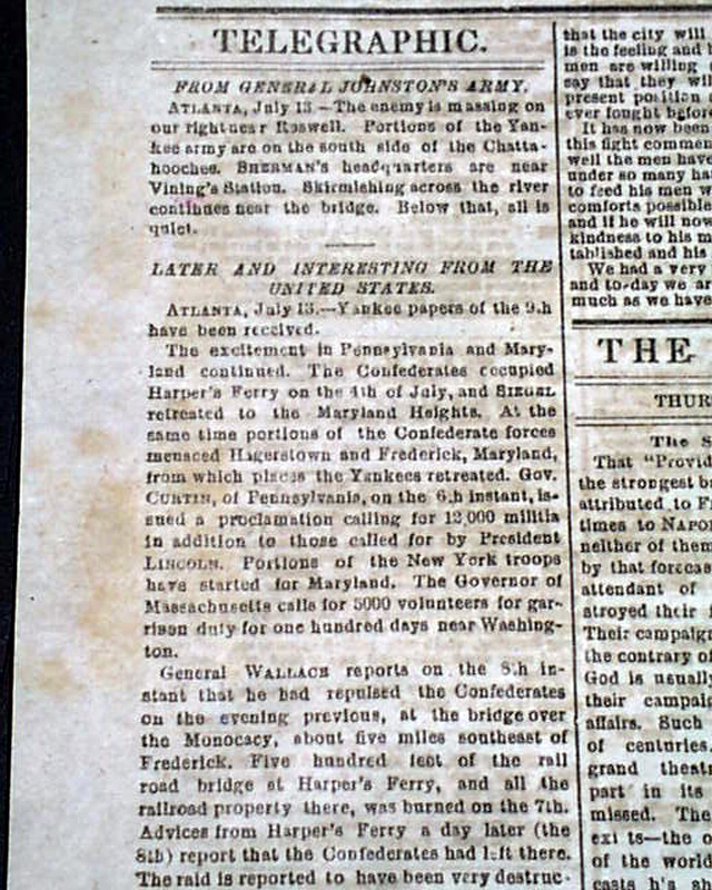 Among the front page column heads on the Civil War are: "From General Johnston's Army" "The Strongest Battalions" "From Our Lines on the Chattahoochee" "A Gallant Charge" "Governor Brown's Proclamation to the People of Georgia" "and more.