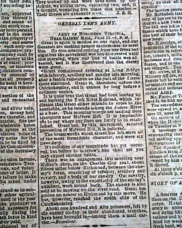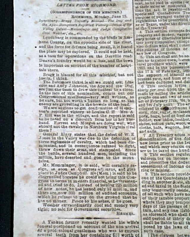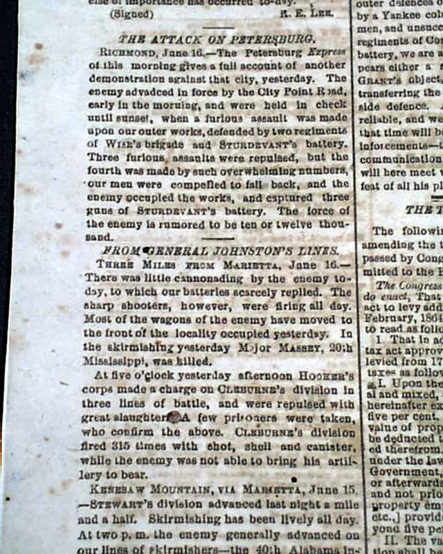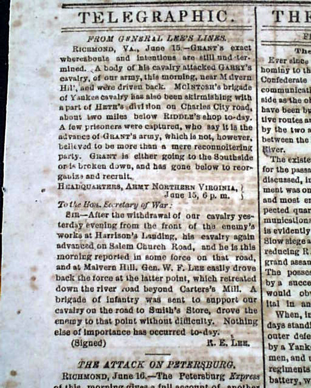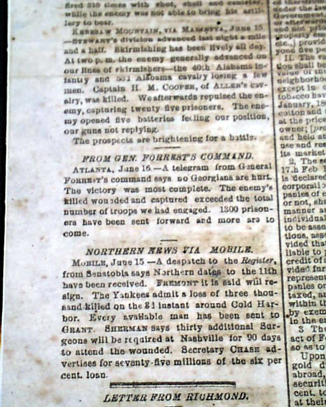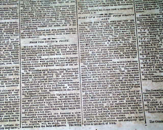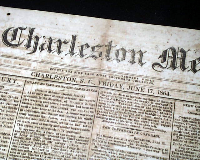 THE CHARLESTON MERCURY, South Carolina, June 17, 1864 Among the front page column heads on the Civil War are: "From the Georgia Front" "Story of a Deserter From Grant's Arms" "General Lee's Army" "The Confederate Congress" "The Attack on Petersburg" "From General Lee's Lines" "From General Johnston's Lines" and more.