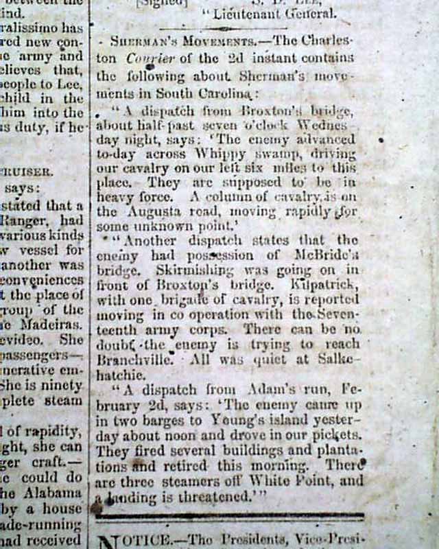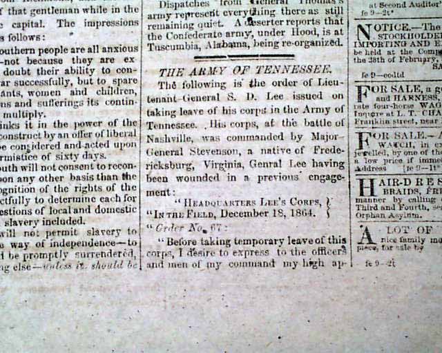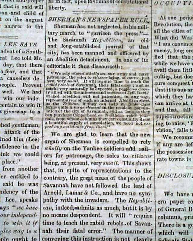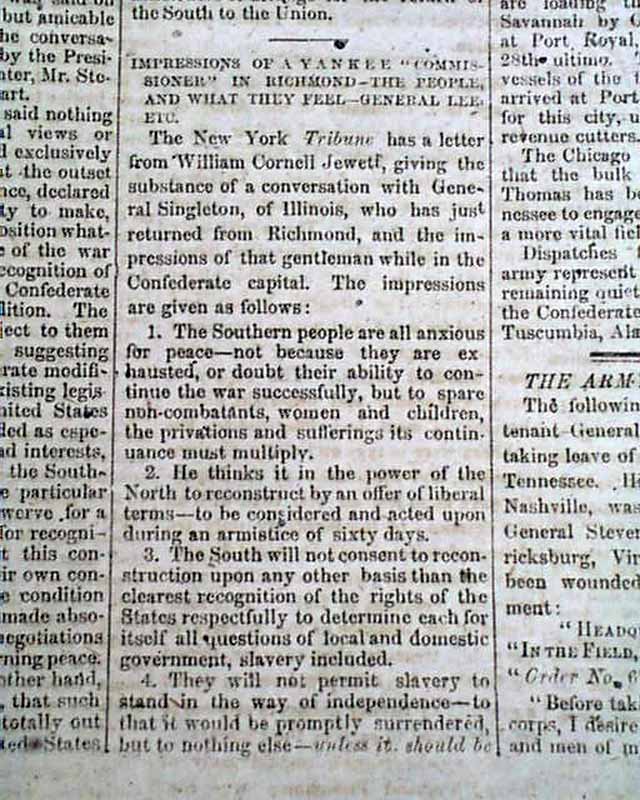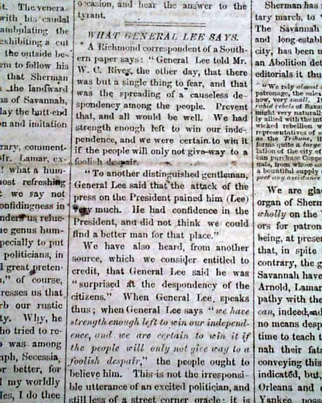 A wealth of fine reporting on the war with front page column heads including: "What General Lee Says" which includes: "...General Lee told...that there was but a single thing to fear, and that was the spreading of a causeless despondency among the people. Prevent that, and all will be well...".