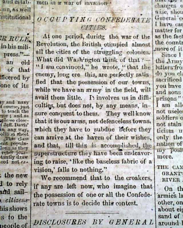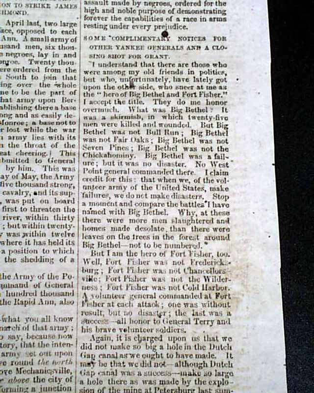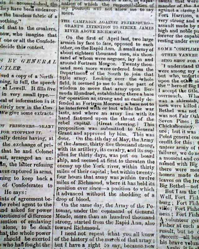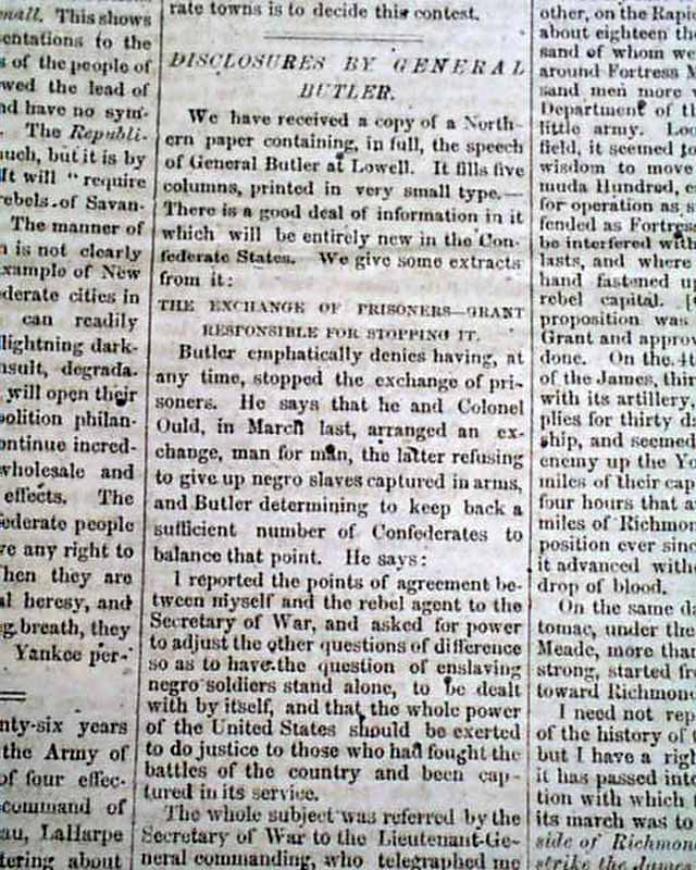 Also: "Disclosures by General Butler' "Occupying Confederates Cities" "Sherman's Newspaper Rule" "The Campaign Against Petersburg--Grant's Intention to Strike James River Above Richmond" "Some Complimentary notices for Other Yankee General & a Closing Shot for Grant".